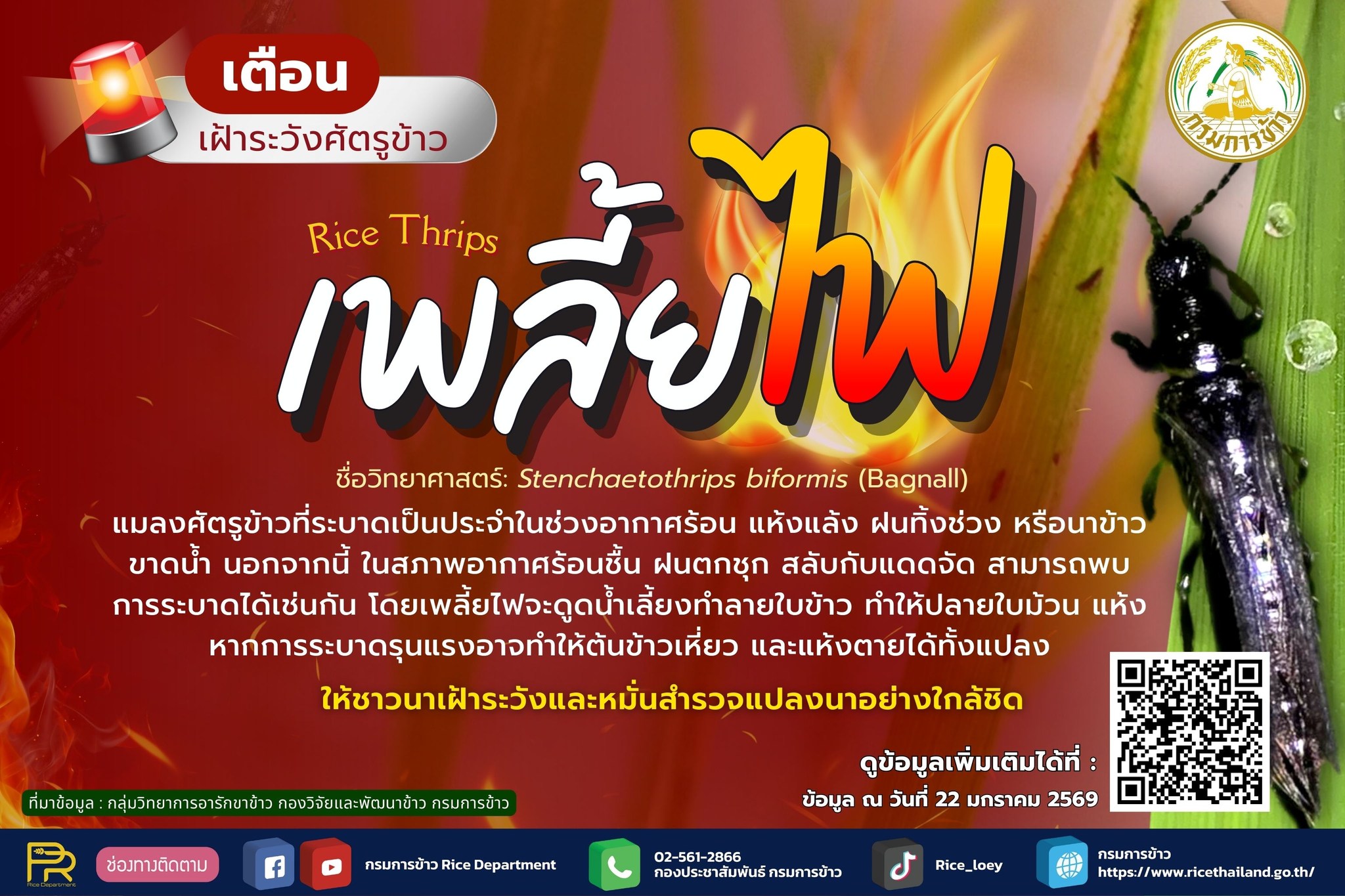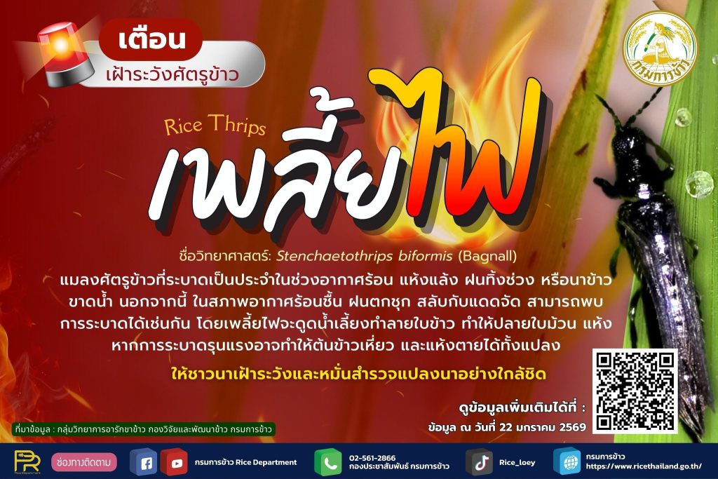 กรมการข้าว แจ้งเตือนเฝ้าระวังศัตรูข้าว เพลี้ยไฟ
