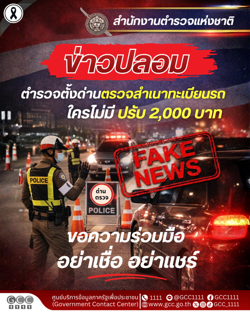 สำนักงานตำรวจแห่งชาติ เตือนข่าวปลอมอ้าง “ตำรวจตั้งด่านตรวจสำเนาทะเบียนรถ ใครไม่มีปรับ 2,000 บาท”