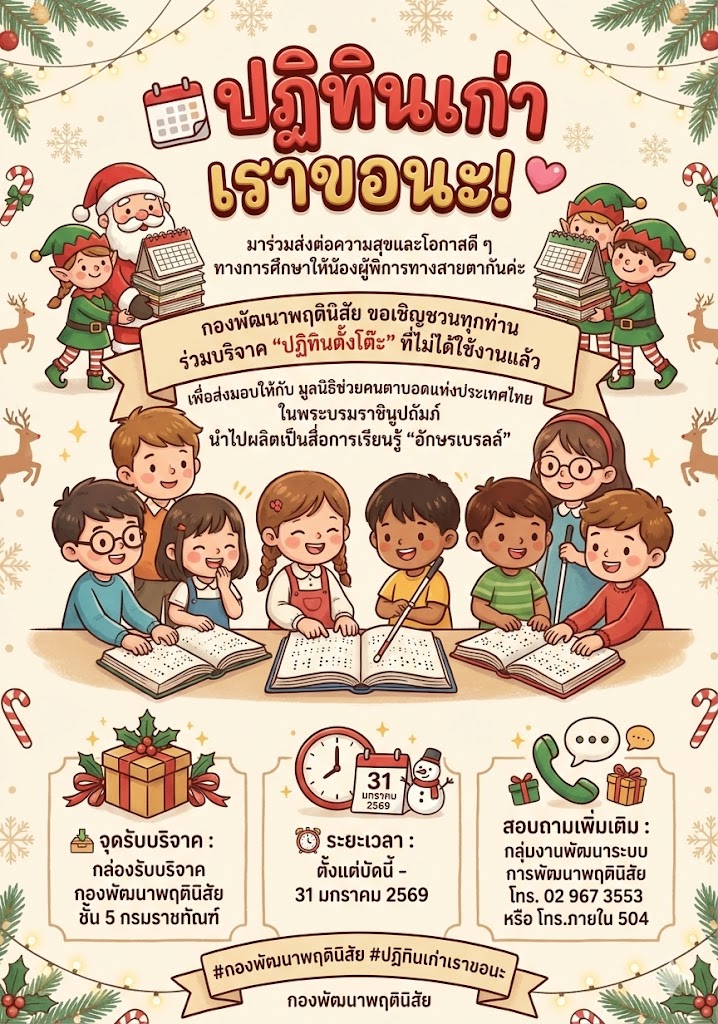 ปฏิทินปีเก่าอย่าเพิ่งทิ้ง ชวนทุกคนมาส่งต่อ ปฏิทินตั้งโต๊ะเก่า ให้กลายเป็นโอกาสทางการศึกษา กองพัฒนาพฤตินิสัย ขอเชิญชวนร่วมบริจาค ปฏิทินตั้งโต๊ะที่ไม่ได้ใช้งานแล้ว เพื่อส่งมอบให้กับ มูลนิธิช่วยคนตาบอดแห่งประเทศไทย ในพระบรมราชินูปถัมภ์ นำไปผลิตเป็นสื่อการเรียนรู้ อักษรเบรลล์ สำหรับน้อง ๆ ผู้พิการทางสายตา