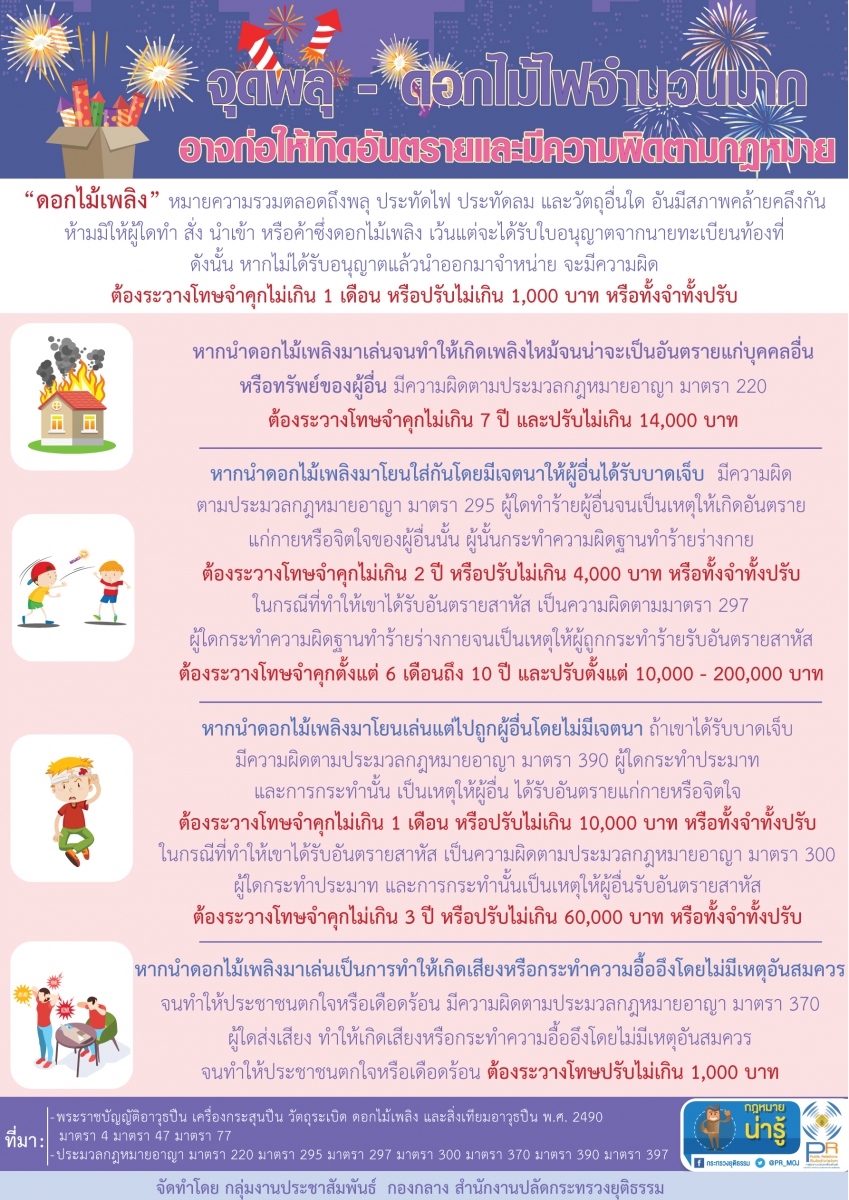 • กระทรวงยุติธรรม แนะนำกฎหมายน่ารู้ จุดพลุ–ดอกไม้ไฟ เสี่ยงอันตราย เสี่ยงผิดกฎหมาย