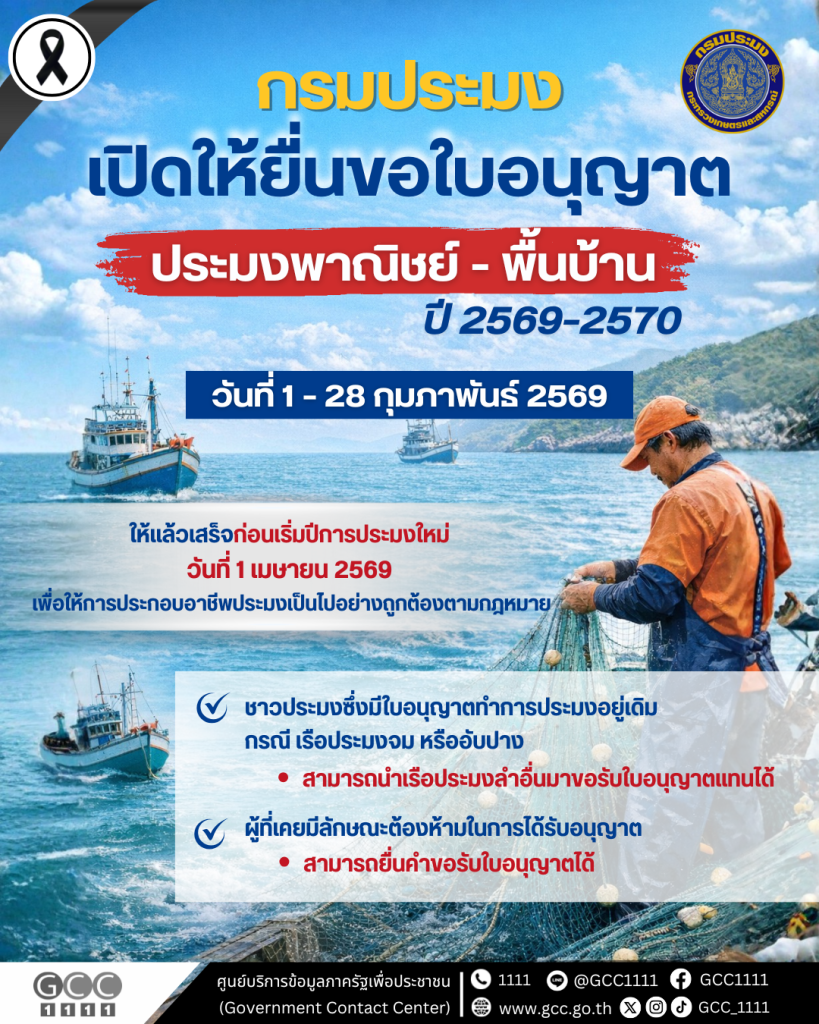 กรมประมง เปิดยื่นขอใบอนุญาตทำการประมงพาณิชย์ – พื้นบ้าน ปี 2569–2570 ระหว่างวันที่ 1 – 28 กุมภาพันธ์ 2569 ซึ่งต้องดำเนินการให้ทันก่อนเริ่มปีการประมงใหม่ในวันที่ 1 เมษายน 2569 เพื่อการทำประมงที่ถูกต้องตามกฎหมาย และเปิดโอกาสให้ชาวประมงซึ่งมีใบอนุญาตทำการประมงอยู่เดิม เรือประมงจม อับปาง สามารถนำเรือประมงลำอื่นมาขอรับใบอนุญาตแทนได้ รวมถึงผู้ที่เคยมีลักษณะต้องห้ามในการได้รับอนุญาต สามารถยื่นคำขอรับใบอนุญาตได้