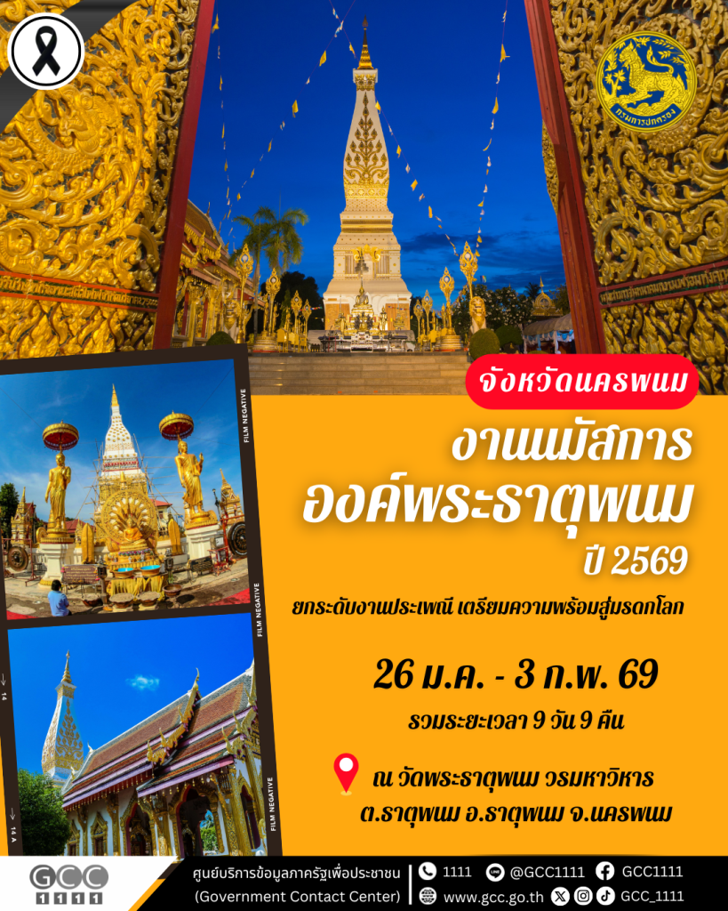 จังหวัดนครพนม จัดงานนมัสการองค์พระธาตุพนม ประจำปี 2569 ยกระดับงานประเพณีเตรียมความพร้อมสู่มรดกโลก วันที่ 26 มกราคม – 3 กุมภาพันธ์ 2569 รวมระยะเวลา 9 วัน 9 คืน ณ วัดพระธาตุพนม วรมหาวิหาร ตำบลธาตุพนม อำเภอธาตุพนม จังหวัดนครพนม