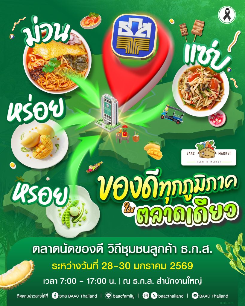 ธนาคารเพื่อการเกษตรและสหกรณ์การเกษตร จัดงาน ตลาดนัดของดี วิถีชุมชนลูกค้า  ในธีม “ของดีทุกภูมิภาค ในตลาดเดียว” วันที่ 28 – 30 มกราคม 2569 เวลา 07.00 – 17.00 น. ณ ธนาคารเพื่อการเกษตรและสหกรณ์การเกษตร (ธ.ก.ส.) สำนักงานใหญ่ บางเขน กรุงเทพมหานคร สามารถนั่งรถไฟฟ้าลงสถานีมหาวิทยาลัยเกษตรศาสตร์ ทางออก 4 ภายในงานพบกับผลิตภัณฑ์สินค้าเกษตร ผลิตภัณฑ์ชุมชน ผลิตภัณฑ์แปรรูป และผ้าพื้นถิ่น จากผู้ผลิตจากผู้ผลิตตัวจริงทั่วไทย สอบถามรายละเอียดเพิ่มเติมได้ที่ Call Center 02 555 0555
