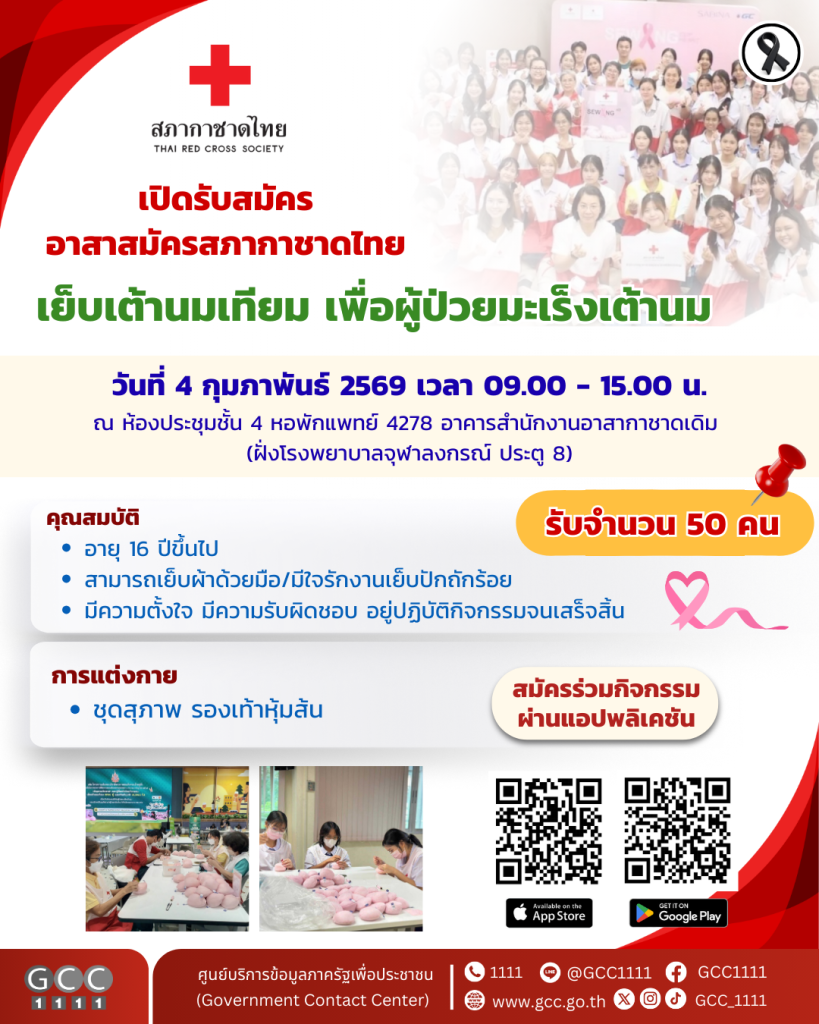 สภากาชาดไทย ชวนอาสาสมัครช่วยเย็บเต้านมเทียม เพื่อผู้ป่วยมะเร็งเต้านม เนื่องในวันมะเร็งโลก (World Cancer Day) วันที่ 4 กุมภาพันธ์ 2569 เวลา 09.00 – 15.00 น. ณ ห้องประชุมชั้น 4 หอพักแพทย์ 4278 อาคารสำนักงานอาสากาชาดเดิม (ฝั่งโรงพยาบาลจุฬาลงกรณ์ ประตู 8) (รับจำนวน 50 คน)