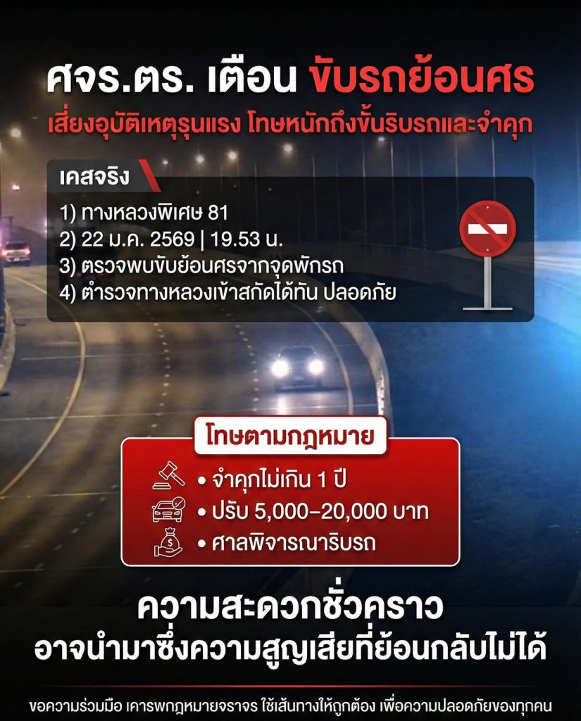 เหตุเกิดเมื่อวันที่ 22 มกราคม 2569 เวลาประมาณ 19.53 น. ภายหลังศูนย์ควบคุมดูแลจราจรบนทางพิเศษตรวจพบรถยนต์นั่งส่วนบุคคลขับย้อนศรจากจุดพักรถ บนทางหลวงพิเศษหมายเลข 81 ฝั่งขาออกมุ่งหน้ากาญจนบุรี และได้แจ้งเตือนผ่านศูนย์วิทยุให้ตำรวจทางหลวงในพื้นที่เข้าดำเนินการทันที เจ้าหน้าที่จึงเร่งออกตรวจสอบและแสดงตัวเข้าสกัดรถคันดังกล่าวได้อย่างปลอดภัย โดยไม่เกิดอุบัติเหตุหรือความเสียหายต่อชีวิตและทรัพย์สินของประชาชน จากการตรวจสอบพบว่าผู้ขับขี่เป็นหญิง อายุ 67 ปี ให้การว่าขับรถย้อนศรเพื่อเดินทางกลับโดยไม่ต้องการใช้เส้นทางตามระบบ ทั้งที่สามารถขับต่อไปและใช้ทางออกเพื่อกลับรถได้อย่างปลอดภัย เจ้าหน้าที่จึงดำเนินคดีในข้อหา “ขับรถโดยไม่คำนึงถึงความปลอดภัยในชีวิตหรือร่างกายของผู้อื่น” ตามพระราชบัญญัติจราจรทางบก พ.ศ.2522