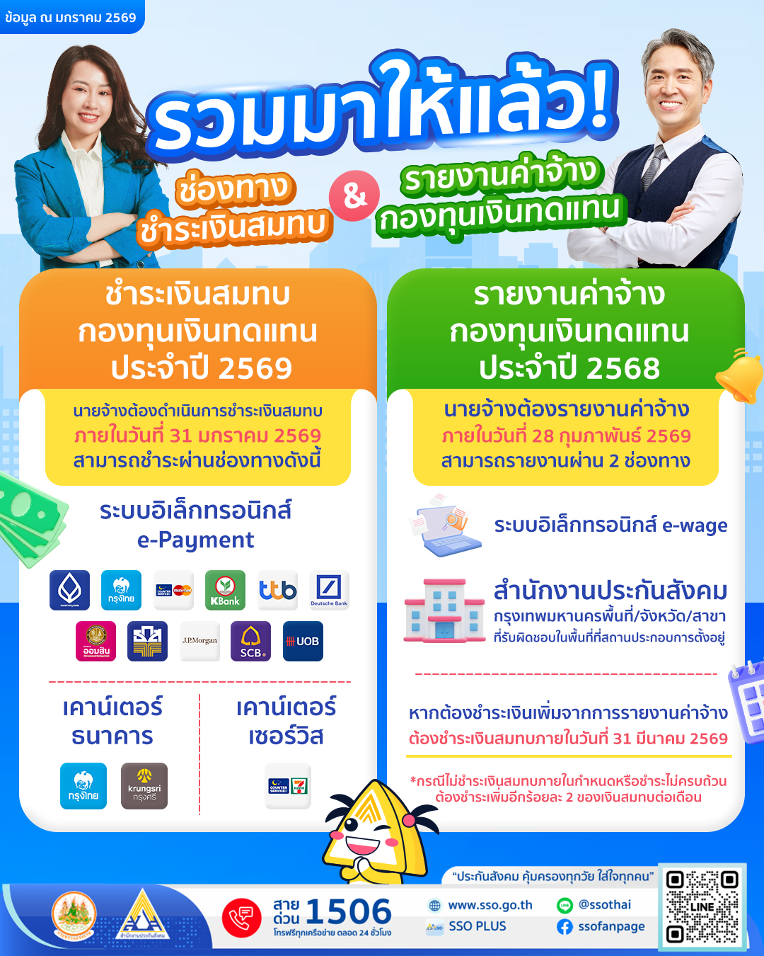 ทั้งนี้ หากนายจ้างพบว่าหลังจากรายงานค่าจ้างแล้ว ต้องชำระเงินสมทบเพิ่มจากการรายงานค่าจ้าง กำหนดชำระเงินภายในวันที่ 31 มีนาคม 2569