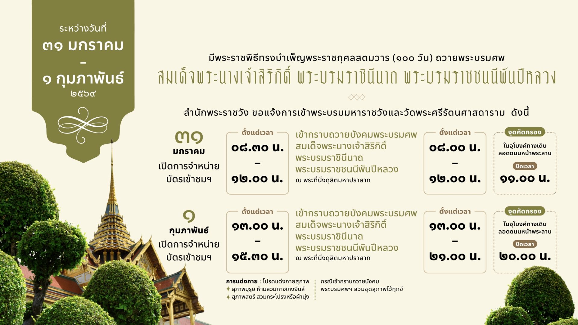 สำนักพระราชวัง ขอแจ้งการเข้าชมพระบรมมหาราชวังและวัดพระศรีรัตนศาสดาราม วันที่ 31 มกราคม – 1 กุมภาพันธ์ 2569 เนื่องจากมีพระราชพิธีทรงบำเพ็ญพระราชกุศลสตมวาร (100 วัน) ถวายพระบรมศพสมเด็จพระนางเจ้าสิริกิติ์ พระบรมราชินีนาถ พระบรมราชชนนีพันปีหลวง ดังนี้