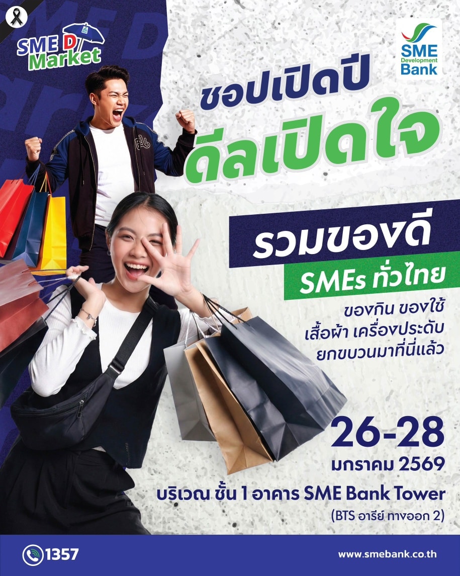ธนาคารพัฒนาวิสาหกิจขนาดกลางและขนาดย่อมแห่งประเทศไทย จัดงาน ตลาด “SME D Market” สุด hot ของย่านอารีย์ ตั้งแต่ 26 – 28 มกราคม 2569 ณ ชั้น 1 อาคาร SME Bank Tower (ติดรถไฟฟ้า BTS สถานีอารีย์) ระดมสินค้าดีจากเอสเอ็มอีทั่วไทย มากกว่า 50 กิจการ มาให้ประชาชนเลือกช้อปกันได้อย่างจุใจ มีทั้งของกิน ของใช้ เครื่องประดับ และเครื่องแต่งกาย ช่วยเพิ่มรายได้ขยายช่องทางตลาดให้แก่ผู้ประกอบการไทย สร้างเศรษฐกิจไทยคึกคักตั้งแต่ต้นปี สำหรับงาน SME D Market จัดขึ้นเป็นประจำทุกเดือน ต่อเนื่องยาวนานมาหลายปี เพื่อช่วยเหลือผู้ประกอบการเอสเอ็มอี มีรายได้เพิ่ม สร้างคุณภาพชีวิตที่ดีขึ้น เกิดการกระตุ้นเศรษฐกิจ สร้างสังคมแห่งความสุข นำไปสู่การเติบโตอย่างสมดุลและยั่งยืนทางเศรษฐกิจและสังคม