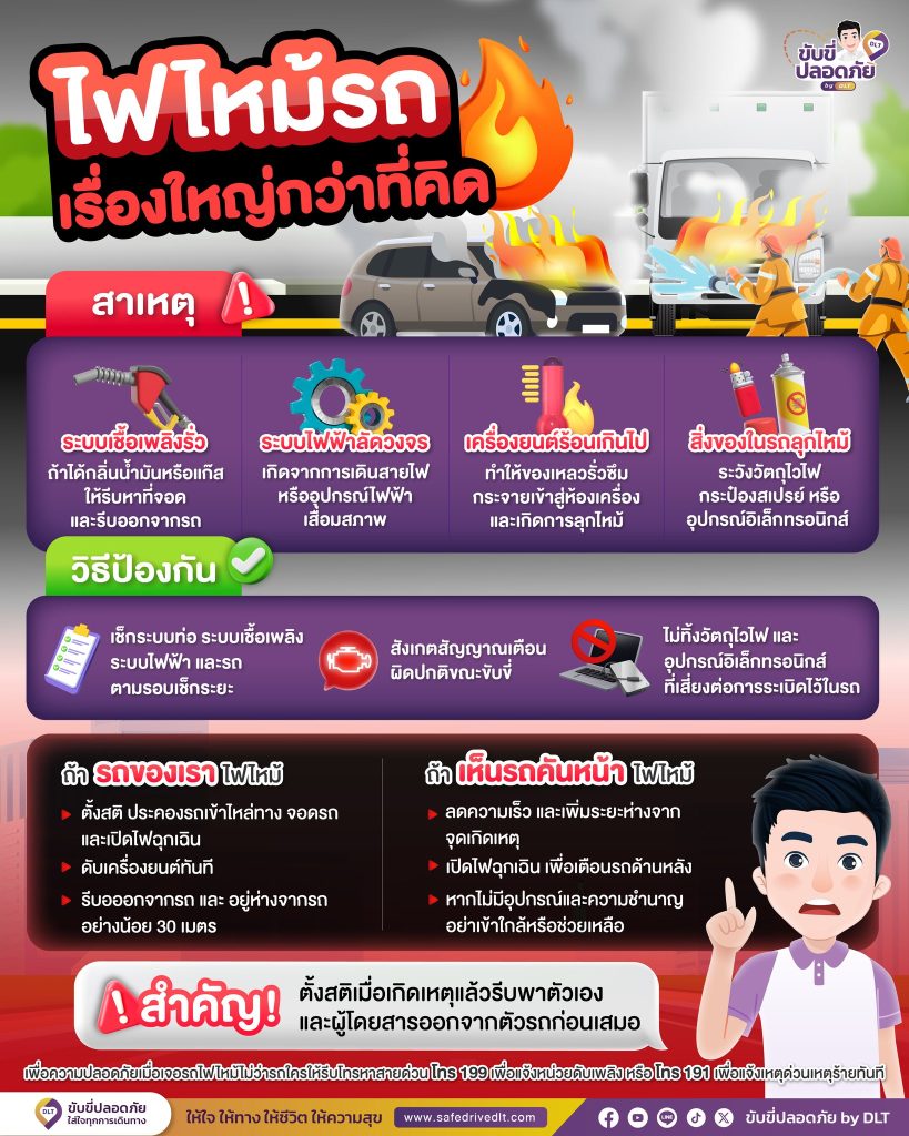 • รถเราไฟไหม้ : ตั้งสติ จอด เปิดไฟฉุกเฉิน ดับเครื่อง ออกจากรถทันที และอยู่ห่างอย่างน้อย 30 เมตร