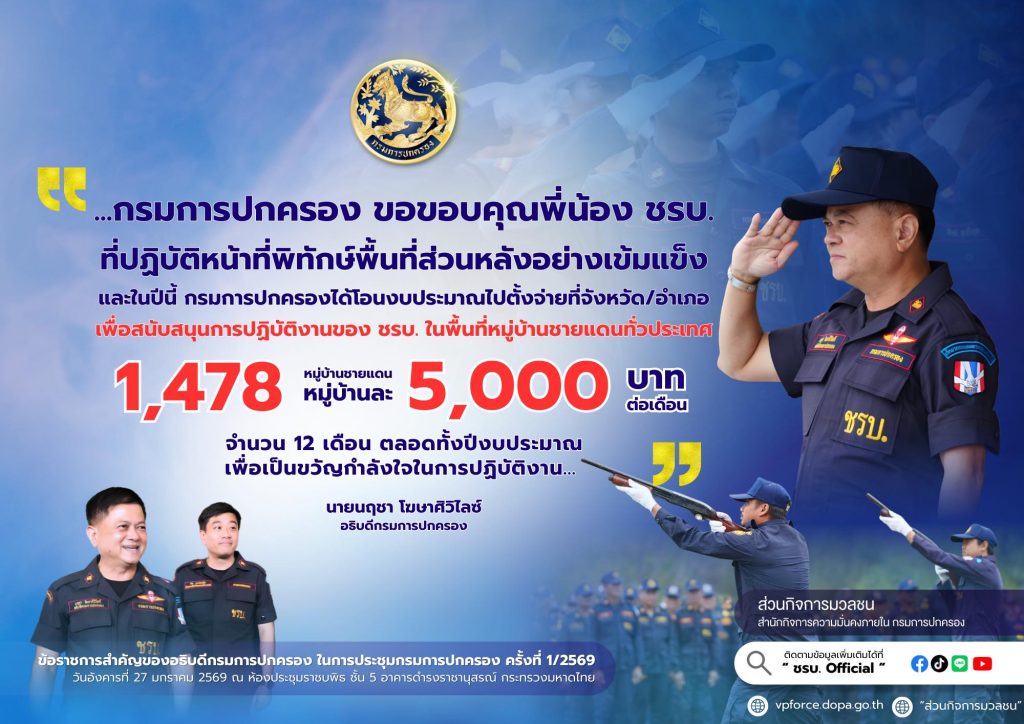 กรมการปกครอง จัดสรรงบประมาณสนับสนุน ชรบ. หมู่บ้านชายแดน 5,000 บาทต่อเดือน ข่าวสารกิจกรรม กรมการปกครอง จัดสรรงบประมาณสนับสนุน ชรบ. หมู่บ้านชายแดน 5,000 บาทต่อเดือน อธิบดีกรมการปกครอง จัดสรรงบประมาณสนับสนุน ชรบ. หมู่บ้านชายแดน 5,000 บาทต่อเดือน กรมการปกครอง ขอขอบคุณพี่น้อง ชรบ. ที่ปฏิบัติหน้าที่พิทักษ์พื้นที่ส่วนหลังอย่างเข้มแข็ง และในปีนี้ กรมการปกครองได้โอนงบประมาณไปตั้งจ่ายที่จังหวัด/อำเภอเพื่อสนับสนุนการปฏิบัติงานของ ชรบ. ในพื้นที่หมู่บ้านชายแดนทั่วประเทศ 1,478 หมู่บ้าน หมู่บ้านละ 5,000 บาท/เดือน จำนวน 12 เดือน ตลอดปีงบประมาณ เพื่อเป็นขวัญกำลังใจในการปฏิบัติงานชุดรักษาความปลอดภัยหมู่บ้าน (ชรบ.)“เกิดมาตอบแทนพระคุณแผ่นดิน” ที่มา : Facebook : กรมการปกครอง Post Views: 17 FacebookFacebookXTwitterLINELine