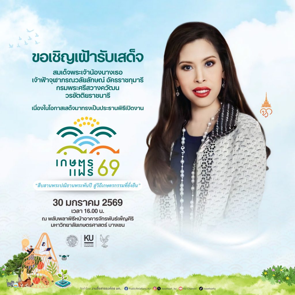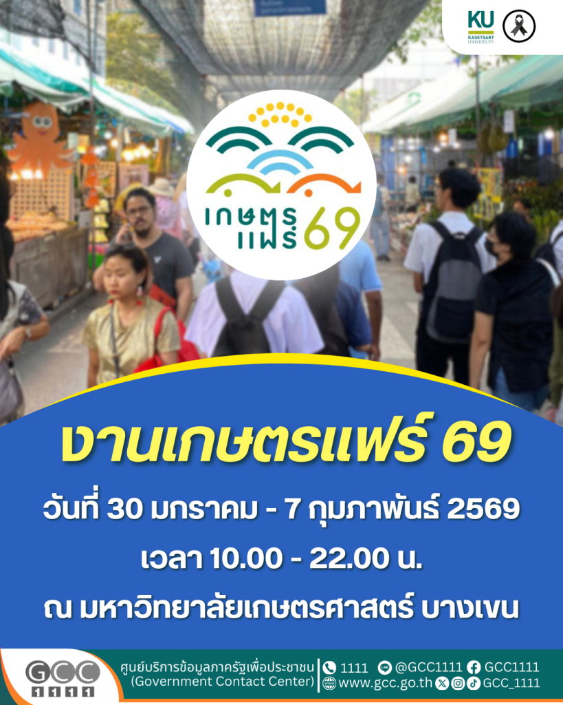 งาน “เกษตรแฟร์ ประจำปี 2569” ข่าวสารกิจกรรม งาน “เกษตรแฟร์ ประจำปี 2569” มหาวิทยาลัยเกษตรศาสตร์ ขอเชิญร่วมงาน “เกษตรแฟร์ ประจำปี 2569” ระหว่างวันที่ 30 มกราคม – 7 กุมภาพันธ์ 2569 ภายใต้แนวคิด “สืบสานพระปณิธานพระพันปี สู่วิถีเกษตรกรรมที่ยั่งยืน” ณ มหาวิทยาลัยเกษตรศาสตร์ บางเขน มหาวิทยาลัยเกษตรศาสตร์ จัดงานยิ่งใหญ่แห่งปี “เกษตรแฟร์ 2569” ภายใต้แนวคิด “สืบสานพระปณิธานพระพันปี สู่วิถีเกษตรกรรมที่ยั่งยืน” การจัดงานในครั้งนี้ มุ่งน้อมนำพระราชปณิธานของสมเด็จพระนางเจ้าสิริกิติ์ พระบรมราชินีนาถ พระบรมราชชนนีพันปีหลวง มาเป็นรากฐานในการพัฒนาองค์ความรู้ด้านการเกษตร อาหาร และสิ่งแวดล้อมเพื่อขับเคลื่อนสังคมไทยไปสู่วิถีเกษตรกรรมแห่งอนาคต ที่มีความมั่นคง สมดุล และยั่งยืน ขอเชิญชวนประชาชนร่วมเป็นส่วนหนึ่งของมหกรรมด้านการเกษตรแห่งปี ซึ่งรวบรวมองค์ความรู้ นวัตกรรม เทคโนโลยี ตลอดจนสีสันและอัตลักษณ์ของเกษตรไทยไว้อย่างครบถ้วน ภายในงานพบกับสินค้าเกษตรคุณภาพ อาหารและผลิตภัณฑ์หลากหลาย พร้อมนวัตกรรมและเทคโนโลยีด้านการเกษตร และกิจกรรมส่งเสริมการเรียนรู้อีกมากมาย ทั้งนี้ ขอเชิญเฝ้ารับเสด็จ สมเด็จพระเจ้าน้องนางเธอ เจ้าฟ้าจุฬาภรณวลัยลักษณ์ อัครราชกุมารี กรมพระศรีสวางควัฒน วรขัตติยราชนารี เนื่องในโอกาสเสด็จมาทรงเป็นประธานพิธีเปิดงาน “เกษตรแฟร์ 69” วันที่ 30 มกราคม 2569 เวลา 16.00 น. ณ พลับพลาพิธีหน้าอาคารจักรพันธ์เพ็ญศิริ มหาวิทยาลัยเกษตรศาสตร์ บางเขน ที่มา : Facebook Kasetsart University Post Views: 489 FacebookFacebookXTwitterLINELine