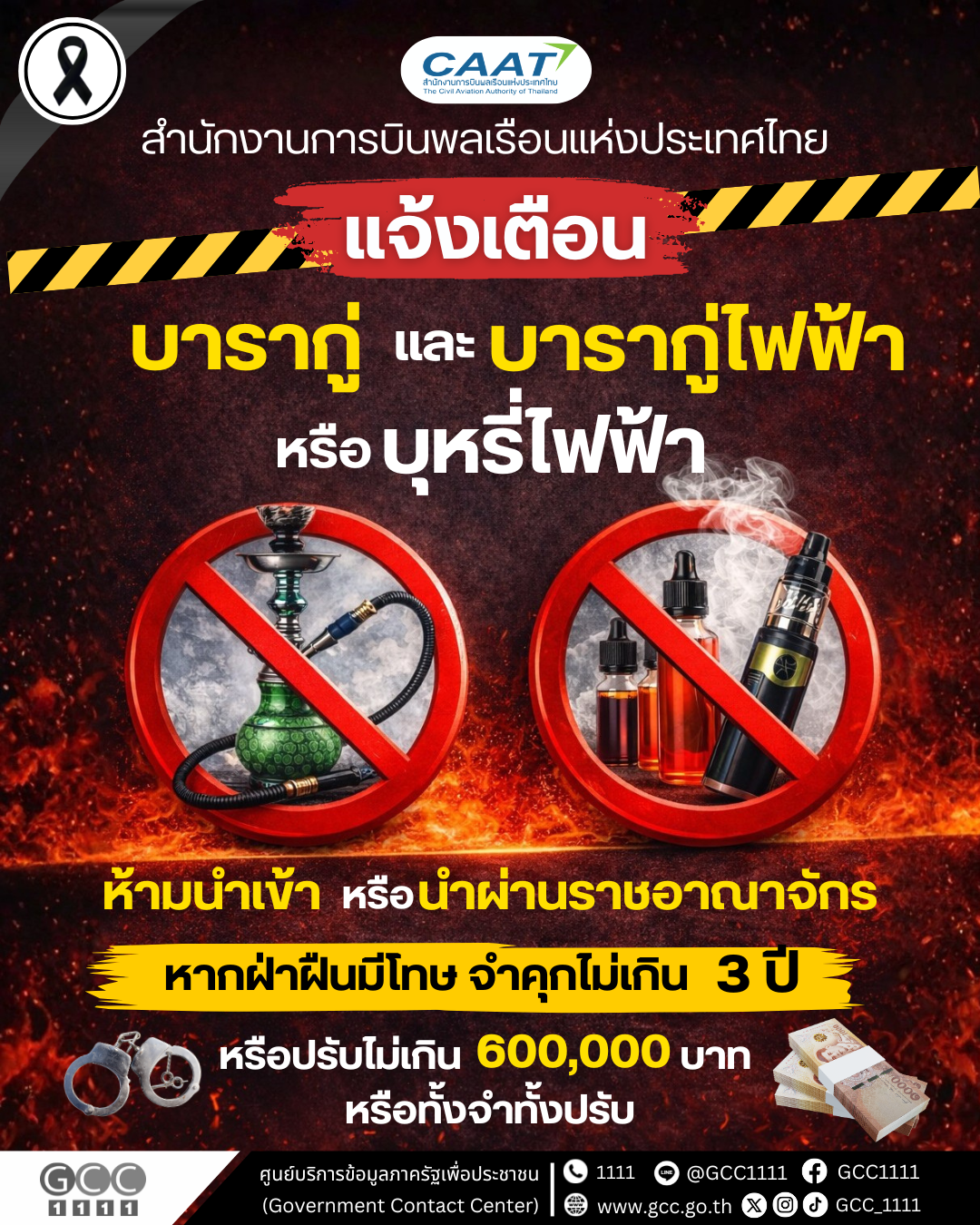 สำนักงานการบินพลเรือนแห่งประเทศไทย แจ้งเตือน บารากู่ และบารากู่ไฟฟ้าหรือบุหรี่ไฟฟ้า ห้ามนำเข้า หรือนำผ่านราชอาณาจักร* ห้ามขายหรือให้บริการสินค้าบารากู่ บารากู่ไฟฟ้าหรือบุหรี่ไฟฟ้า หรือตัวยาบารากู่ น้ำยาสำหรับเติมบารากู่ไฟฟ้าหรือบุหรี่ไฟฟ้า หากฝ่าฝืนมีโทษจำคุกไม่เกิน 3 ปี หรือปรับไม่เกิน 600,000 บาท หรือทั้งจำทั้งปรับ**