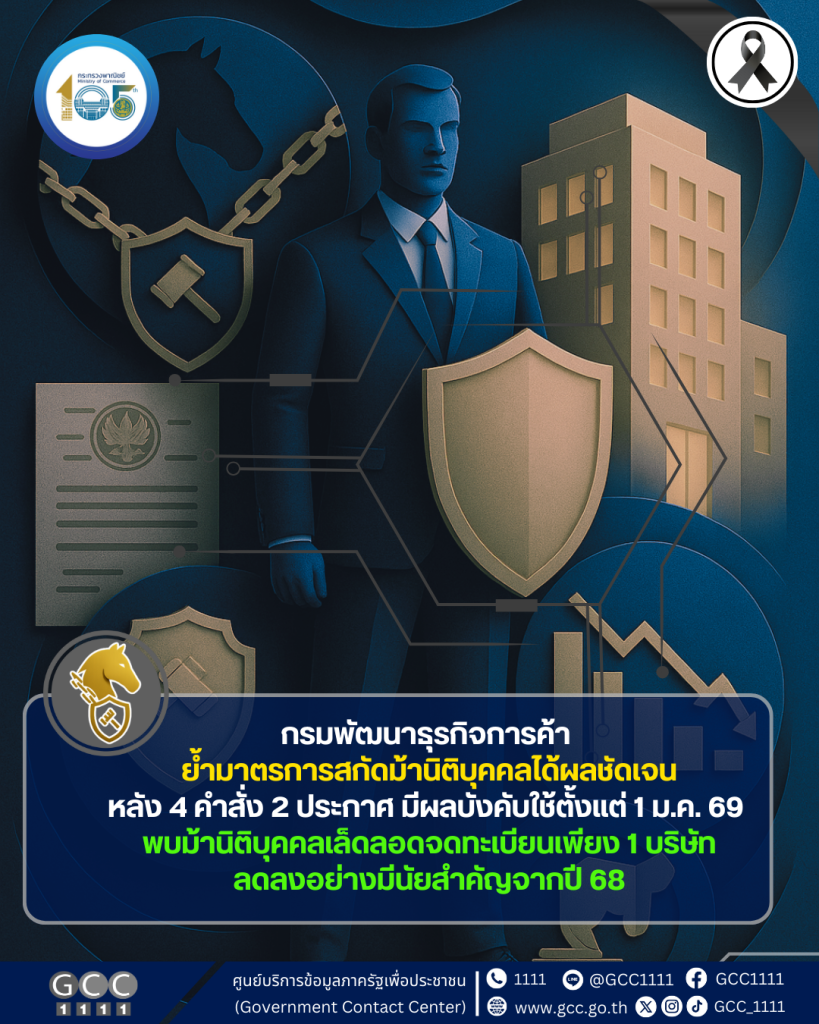 กรมพัฒนาธุรกิจการค้า รายงานผลหลัง 4 คำสั่ง 2 ประกาศ มีผลบังคับใช้ตั้งแต่ 1 ม.ค.69 เห็นผลทันตา มีม้านิติบุคคลเล็ดลอดมาจดทะเบียนจัดตั้งธุรกิจเพียง 1 บริษัท จากเมื่อ 9 เดือนปี 68 (1 ม.ค. – 30 ก.ย.) มีมากถึง 478 บริษัท และ 3 เดือนท้ายปี (1 ต.ค. – 31 ธ.ค.) เหลือ 71 ราย กรมฯ มาถูกทางแล้ว ใช้มาตรการเข้มข้นสกัดม้านิติบุคคลได้อยู่หมัด ยังไม่พอเดินหน้าแล้วต้องไปให้สุด!! จับมือพันธมิตรกำหนดมาตรการใหม่ๆ ให้เข้มข้นยิ่งขึ้น พร้อมลงพื้นที่ลุยปราบนอมินีบัญชีม้าเชิงรุกต่อเนื่อง เชื่อ!! มิจฉาชีพคงไม่หยุดแค่นี้ ภาครัฐจึงต้องจับมือกันให้แน่นร่วมปราบปรามนอมินีบัญชีม้าให้สิ้นซาก