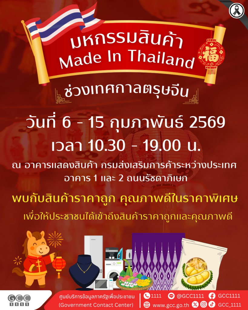 กรมส่งเสริมการค้าระหว่างประเทศ จัดงานมหกรรมสินค้าเมดอินไทยแลนด์(Made In Thailand) ช่วงเทศกาลตรุษจีน ตั้งแต่วันที่ 6 – 15 กุมภาพันธ์ 2569 ณ อาคารแสดงสินค้า กรมส่งเสริมการค้าระหว่างประเทศ อาคาร 1 และ 2 ถนนรัชดาภิเษก