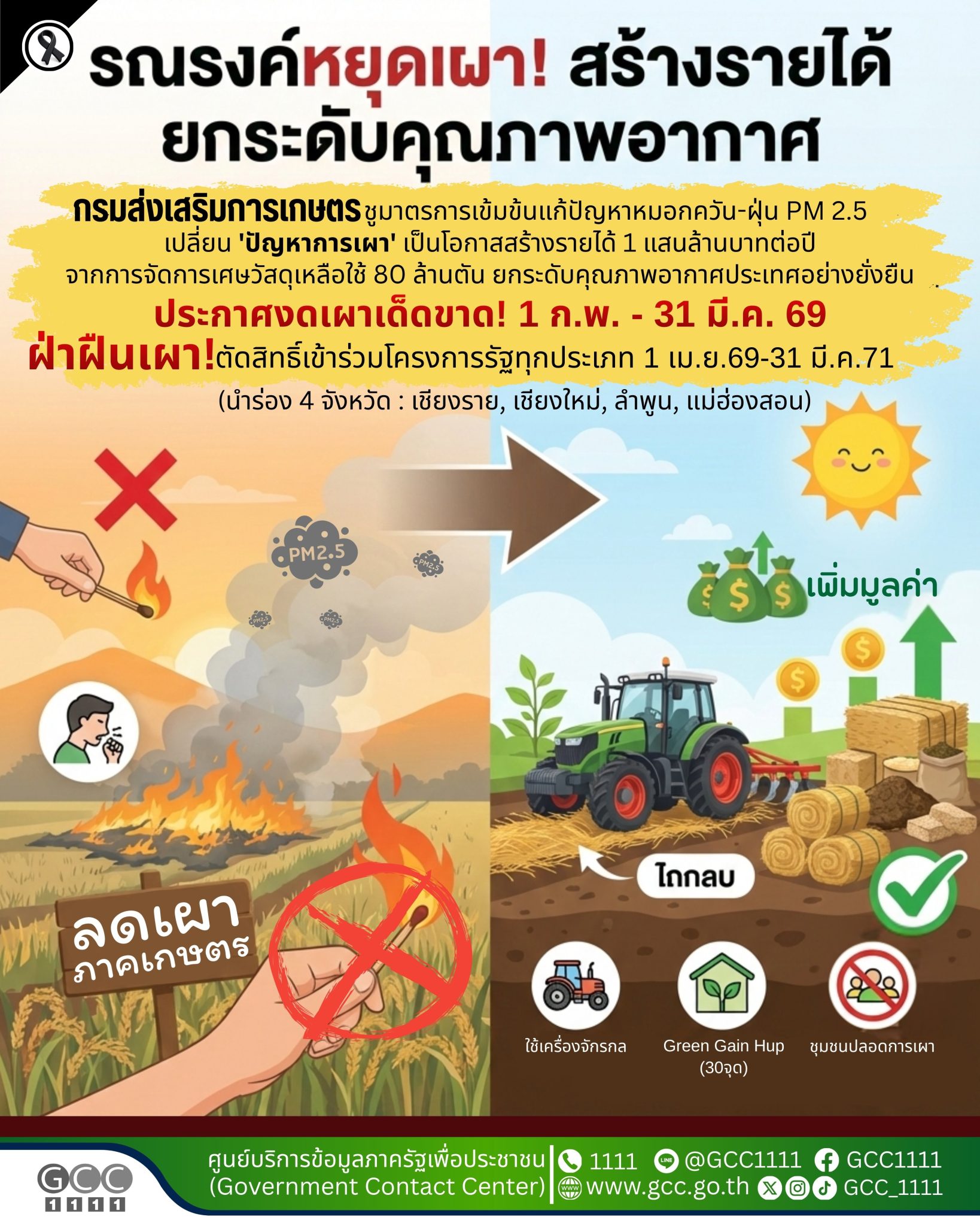 โดยปีที่ผ่านมา ลดลงต่อเนื่องจากปี 2567 ที่มีพื้นที่เผากว่า 2 หมื่นจุด มีเครือข่ายเกษตรกรปลอดการเผาเกิดขึ้นหลายพันราย มีการบริหารจัดการเศษวัสดุเหลือใช้ทางการเกษตรที่เกิดขึ้นปีละประมาณ 80 ล้านต้นนำมาเพิ่มมูลค่าทางเศรษฐกิจได้กว่า 1 แสนล้านบาทต่อปี จึงเดินหน้าการดำเนินงานอย่างเป็นระบบเพื่อเปลี่ยนปัญหาเผาให้เป็นโอกาสในการสร้างรายได้ และยกระดับคุณภาพอากาศประเทศอย่างยั่งยืน