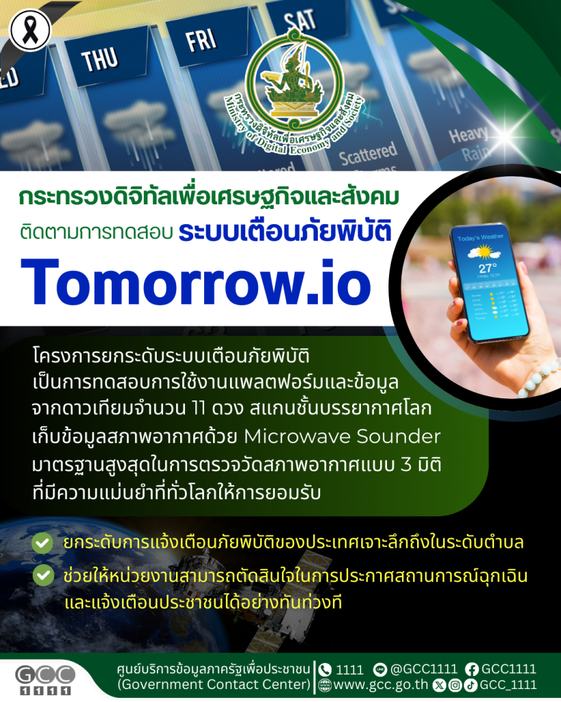 กระทรวงดิจิทัลเพื่อเศรษฐกิจและสังคม ติดตามการทดสอบระบบเตือนภัยพิบัติ Tomorrow.io สำหรับโครงการยกระดับระบบเตือนภัยพิบัติ เป็นการทดสอบนำร่องการใช้งานแพลตฟอร์มและข้อมูลที่ได้จากดาวเทียมจำนวน 11 ดวง โดยการสแกนชั้นบรรยากาศโลก เพื่อเก็บข้อมูลสภาพอากาศด้วย Microwave Sounder ถือเป็นเทคโนโลยีที่มีเฉพาะ Tomorrow.io เพียงแห่งเดียวในโลก ซึ่งถือเป็นมาตรฐานสูงสุดในการตรวจวัดสภาพอากาศแบบ 3 มิติ ที่มีความแม่นยำ ที่ทั่วโลกให้การยอมรับ และถือเป็นมาตรฐานสูงสุดของการพยากรณ์อากาศ ซึ่งจะยกระดับการแจ้งเตือนภัยพิบัติของประเทศ เจาะลึกถึงในระดับตำบล ช่วยให้หน่วยงานสามารถตัดสินใจในการประกาศสถานการณ์ฉุกเฉิน และแจ้งเตือนประชาชนได้อย่างทันท่วงที