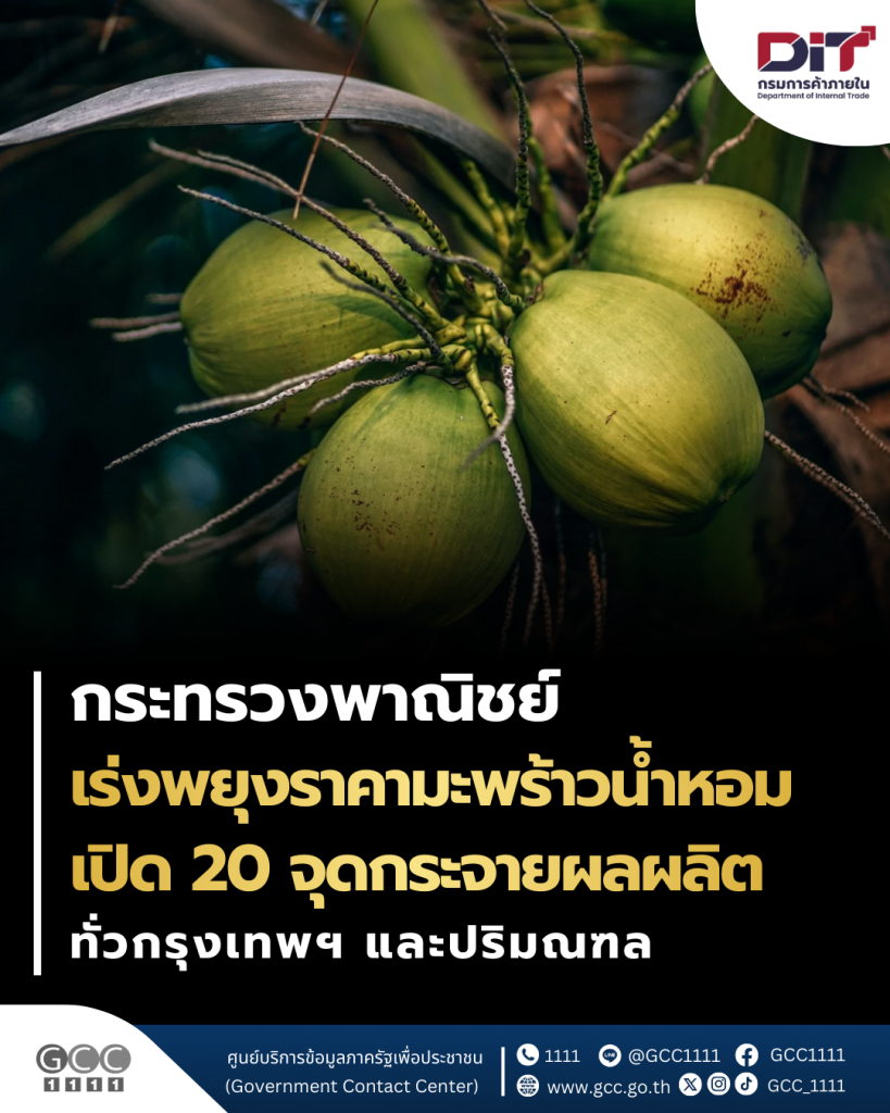 กระทรวงพาณิชย์ เร่งพยุงราคามะพร้าวน้ำหอม เปิด 20 จุดกระจายผลผลิตกว่า 2 แสนลูกทั่ว กทม. – ปริมณฑล