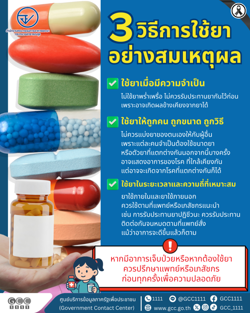 สำนักงานคณะกรรมการอาหารและยา แนะนำ แนวทางในการใช้ยาอย่างสมเหตุผล ด้วย 3 วิธีการใช้ยาอย่างสมเหตุผล โดยร่วมขับเคลื่อนนโยบายกระทรวงสาธารณสุข เพื่อรณรงค์ให้ประชาชนรอบรู้เพื่ออยู่อย่างมีคุณภาพชีวิต