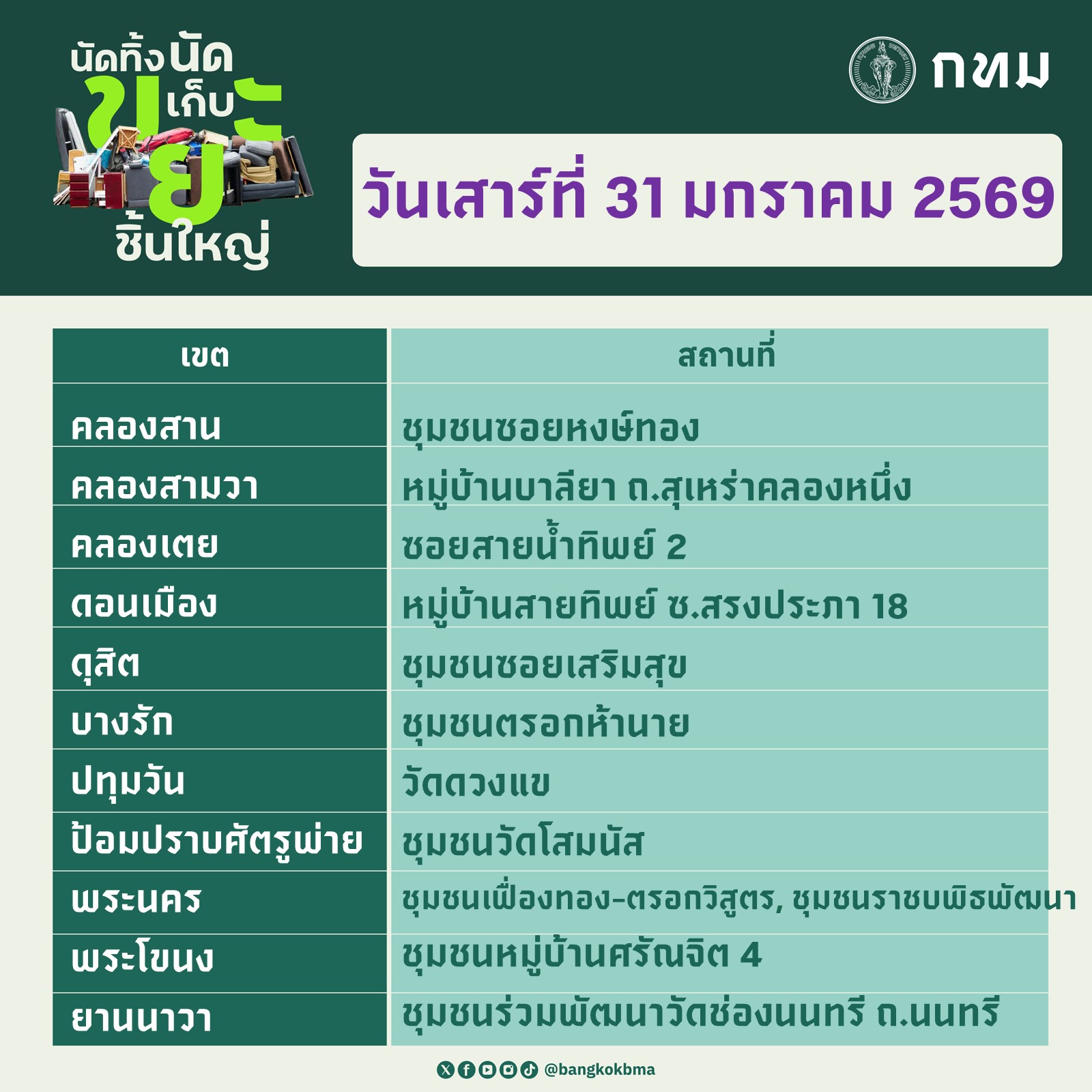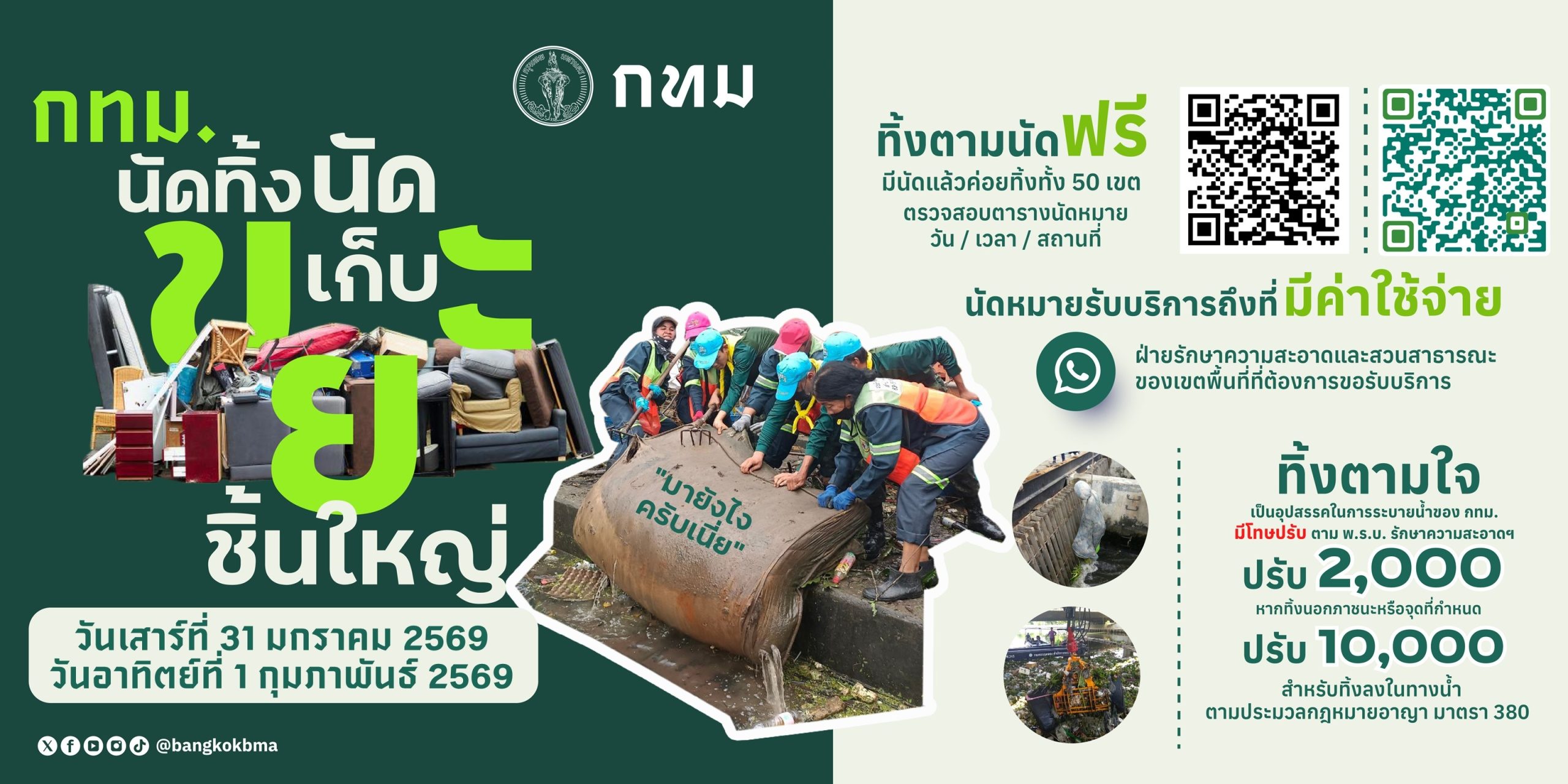 กรุงเทพมหานคร นัดทิ้ง นัดเก็บ ขยะชิ้นใหญ่ ในวันเสาร์ที่ 31 มกราคม 2569 และวันอาทิตย์ที่ 1 กุมภาพันธ์ 2569 ตั้งแต่เวลา 09.00 – 12.00 น. ทุกสำนักงานเขตให้บริการฟรี โดยไม่มีค่าใช้จ่าย ขอความร่วมมือนำขยะชิ้นใหญ่และสิ่งของเหลือใช้ออกมาทิ้ง ณ บริเวณจุดพักขยะหน้าบ้านพักอาศัยก่อนเวลา 08.30 น.