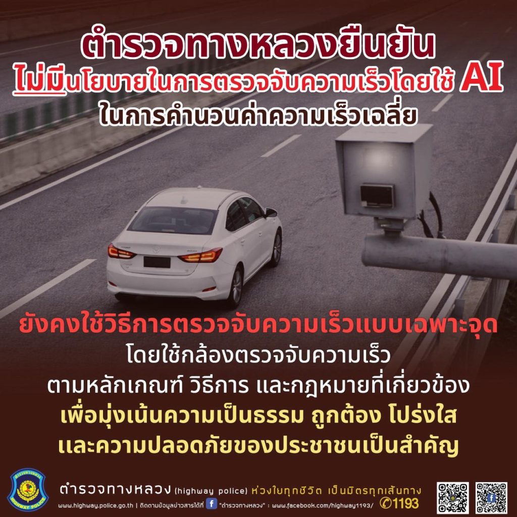 กองบังคับการตำรวจทางหลวง ยืนยัน ไม่มีนโยบายในการตรวจจับความเร็วโดยใช้ AI ในการคำนวนค่าความเร็วเฉลี่ย ตามที่ปรากฏข้อมูลในสื่อสังคมออนไลน์ ในลักษณะว่ากองบังคับการตำรวจทางหลวง จะใช้มาตรการตรวจจับความเร็วแบบ ค่าเฉลี่ย ซึ่งจะเริ่มวันที่ 1 กุมภาพันธ์ 2569 เป็นต้นไป ขอยืนยันว่า ข้อมูลดังกล่าวไม่เป็นความจริงแต่อย่างใด ทั้งนี้ยังคงใช้วิธีการตรวจจับความเร็วแบบเฉพาะจุด โดยใช้กล้องตรวจจับความเร็ว ตามหลักเกณฑ์ วิธีการ และกฎหมายที่เกี่ยวข้อง เพื่อมุ่งเน้นความเป็นธรรม ถูกต้อง โปร่งใส และความปลอดภัยของประชาชนเป็นสำคัญ