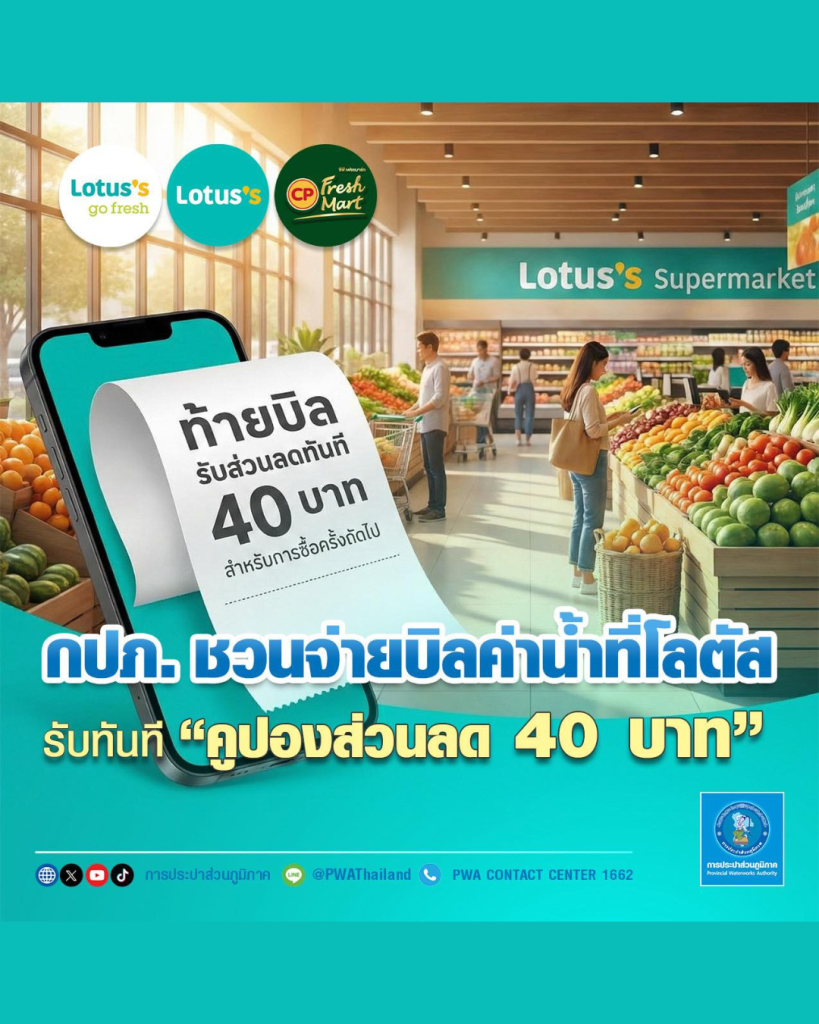 การประปาส่วนภูมิภาค (กปภ.) ร่วมกับ บริษัท ซีพี แอ็กซ์ตร้า จำกัด (มหาชน) จัดโปรโมชันพิเศษเชิญชวนลูกค้าชำระบิลค่าน้ำประปาที่โลตัสสาขาที่ร่วมรายการ รับคูปองส่วนลดท้ายบิลรวมมูลค่าสูงสุด 40 บาท สำหรับใช้เป็นส่วนลดในการซื้อสินค้าครั้งถัดไป ตั้งแต่บัดนี้ – 31 มีนาคม 2569