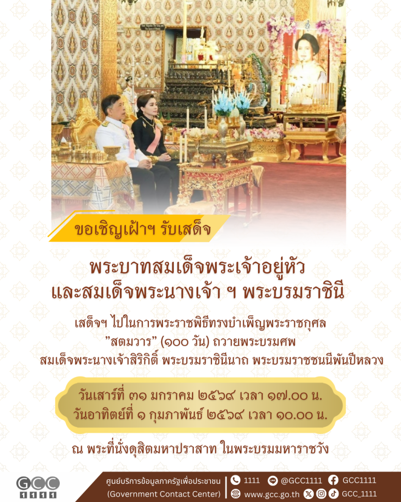 ขอเชิญประชาชนเฝ้าฯ รับเสด็จ พระบาทสมเด็จพระเจ้าอยู่หัว และสมเด็จพระนางเจ้า ฯ พระบรมราชินี เสด็จพระราชดำเนินไปในการพระราชพิธีทรงบำเพ็ญพระราชกุศลสตมวารถวายพระบรมศพ สมเด็จพระนางเจ้าสิริกิติ์ พระบรมราชินีนาถ พระบรมราชชนนีพันปีหลวง วันเสาร์ที่ 31 มกราคม – วันอาทิตย์ทึ่ 1 กุมภาพันธ์ 2569 ณ พระที่นั่งดุสิตมหาปราสาท ในพระบรมมหาราชวัง หมายกำหนดการ :  https://ratchakitcha.soc.go.th/documents/103246.pdf  หมายเหตุ : สตมวาร (สะ – ตะ – มะ – วาน) หากเป็นภาษาสามัญทั่วไป คือ การทำบุญอุทิศแก่ผู้ล่วงลับ วันที่ครบ 100 วัน และเป็นคำที่ใช้ในการเรียกวาระสำคัญของการบำเพ็ญพระราชกุศล ครบ 100 วัน ในการเสด็จสวรรคต