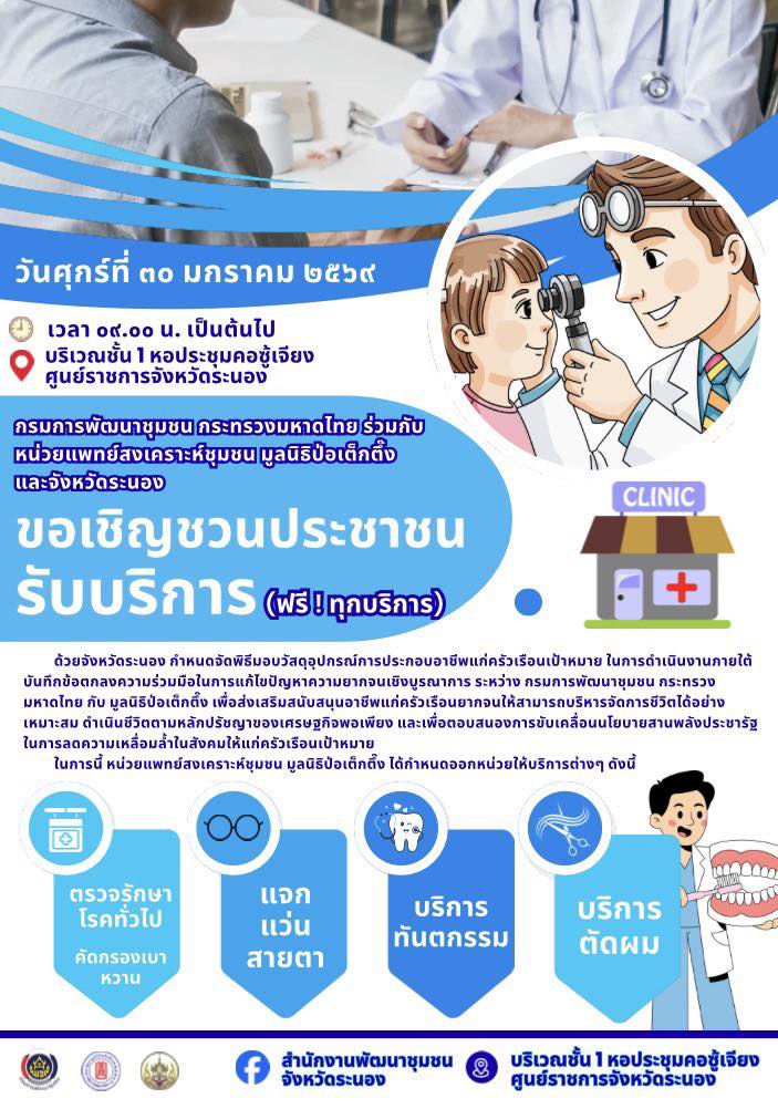 สำนักงานพัฒนาชุมชน จ.ระนอง ขอเชิญชวนรับบริการตรวจรักษาโรคทั่วไป และอื่นๆ ฟรีทุกบริการ วันที่ 30 ม.ค. 69