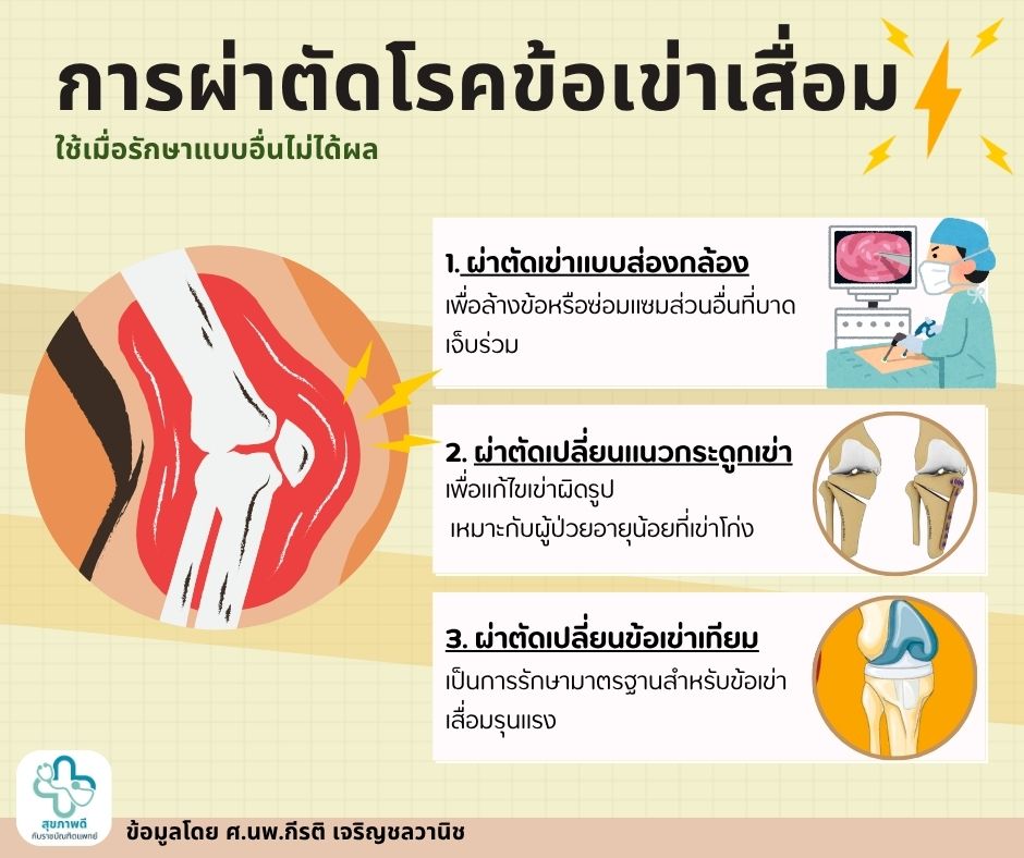 • ผ่าตัดเปลี่ยนข้อเข่าเทียม เป็นการรักษามาตรฐานสำหรับข้อเข่าเสื่อมรุนแรง