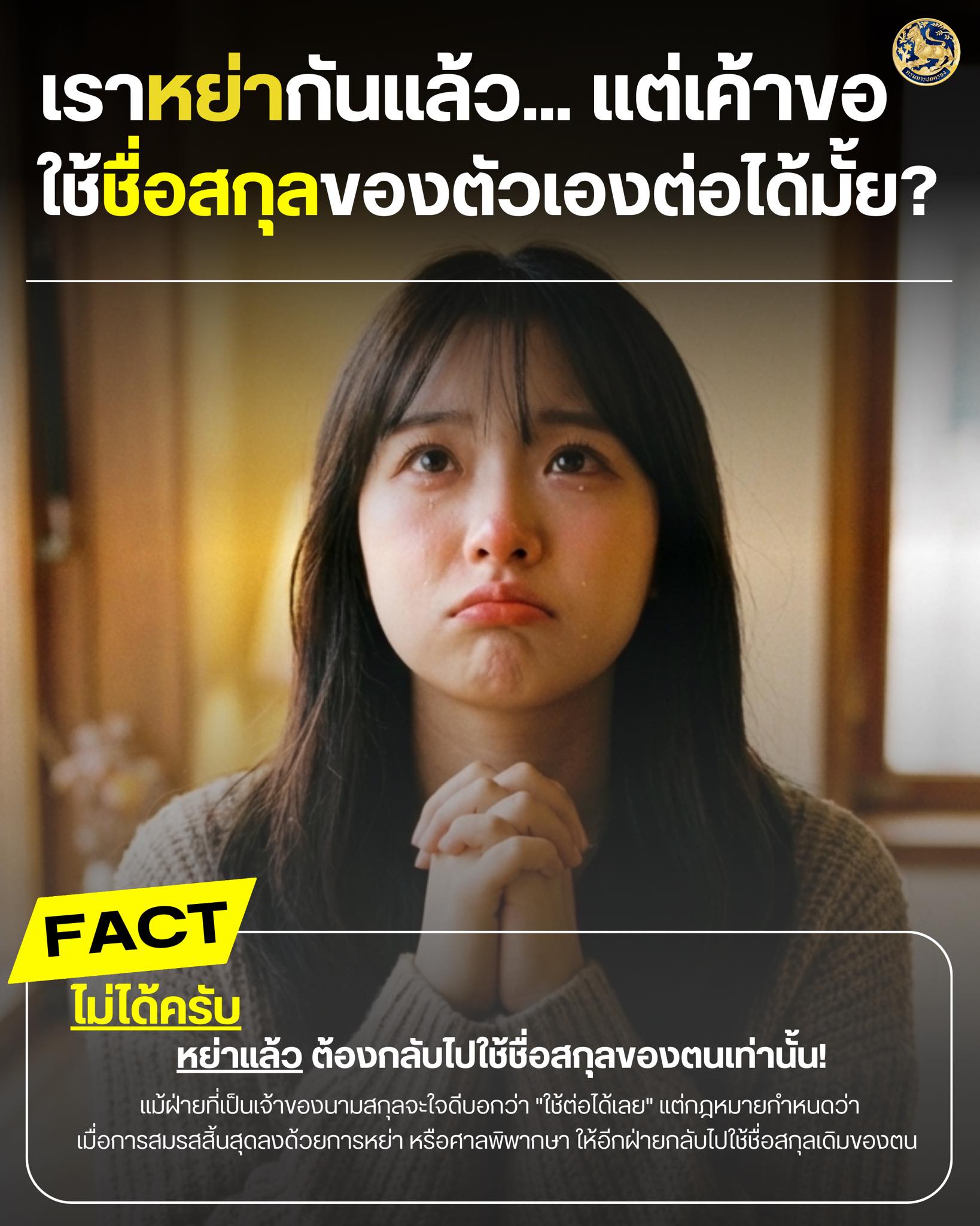 กรมการปกครอง ชี้แจงหลักเกณฑ์การใช้ชื่อสกุลภายหลังการหย่า