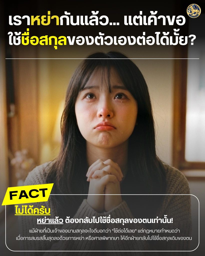 กรมการปกครอง ชี้แจงหลักเกณฑ์การใช้ชื่อสกุลภายหลังการหย่า เมื่อการสมรสสิ้นสุดลงด้วยการหย่า อดีตคู่สมรส ไม่สามารถยินยอมให้อีกฝ่ายใช้ชื่อสกุลของตนต่อไปได้