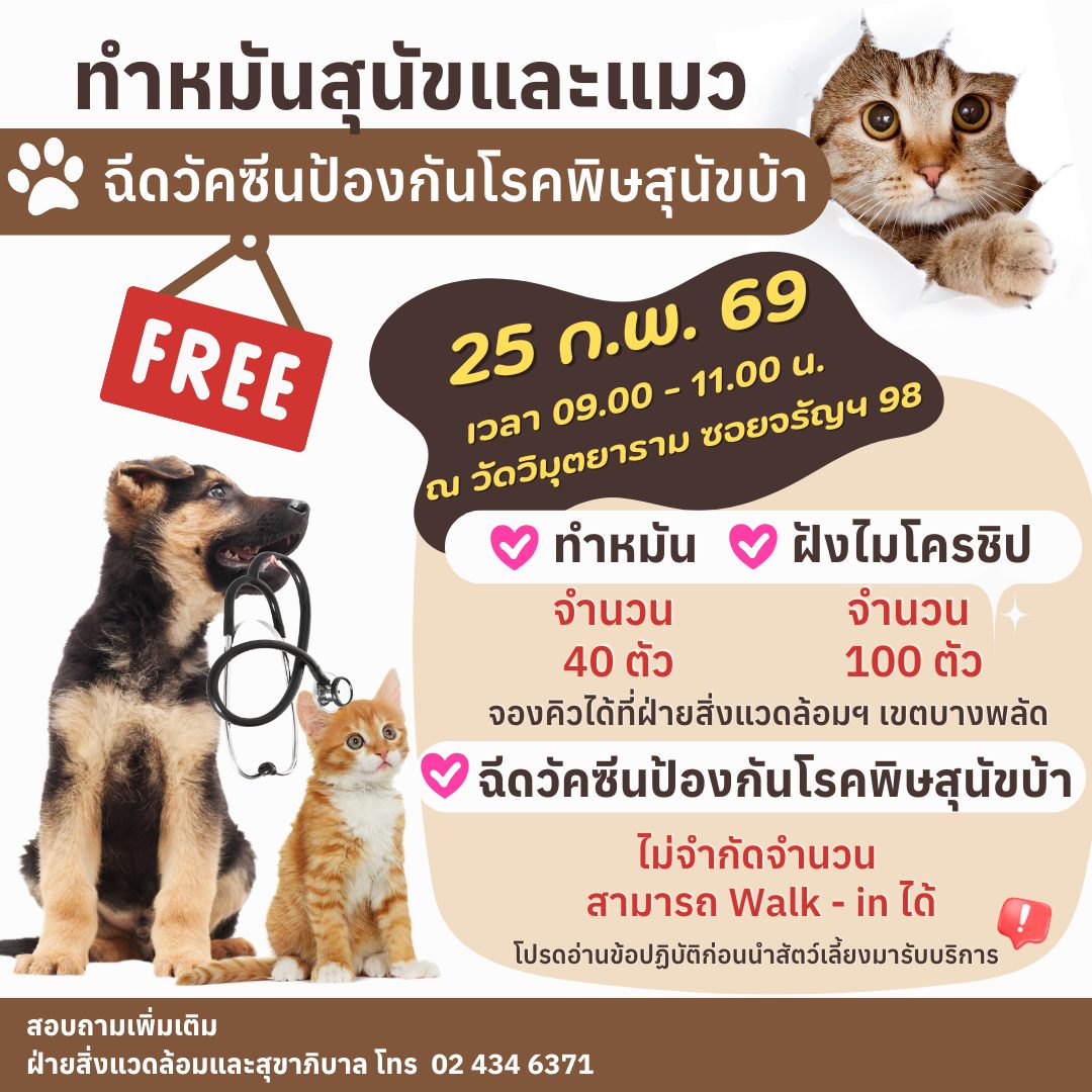 สำนักงานเขตบางพลัด ร่วมกับสำนักงานสัตวแพทย์ สำนักอนามัย กรุงเทพมหานคร ออกหน่วยเคลื่อนที่ทำหมันสุนัข/แมว ฝังไมโครชิปสุนัข/แมว และฉีดวัคซีนป้องกันโรคพิษสุนัขบ้าให้กับสัตว์เลี้ยงของประชาชน ในวันพุธที่ 25 กุมภาพันธ์ 2569 เวลา 09.00 – 11.00 น. ณ วัดวิมุตยาราม ซอยจรัญสนิทวงศ์ 98 แขวงบางอ้อ เขตบางพลัด กทม.