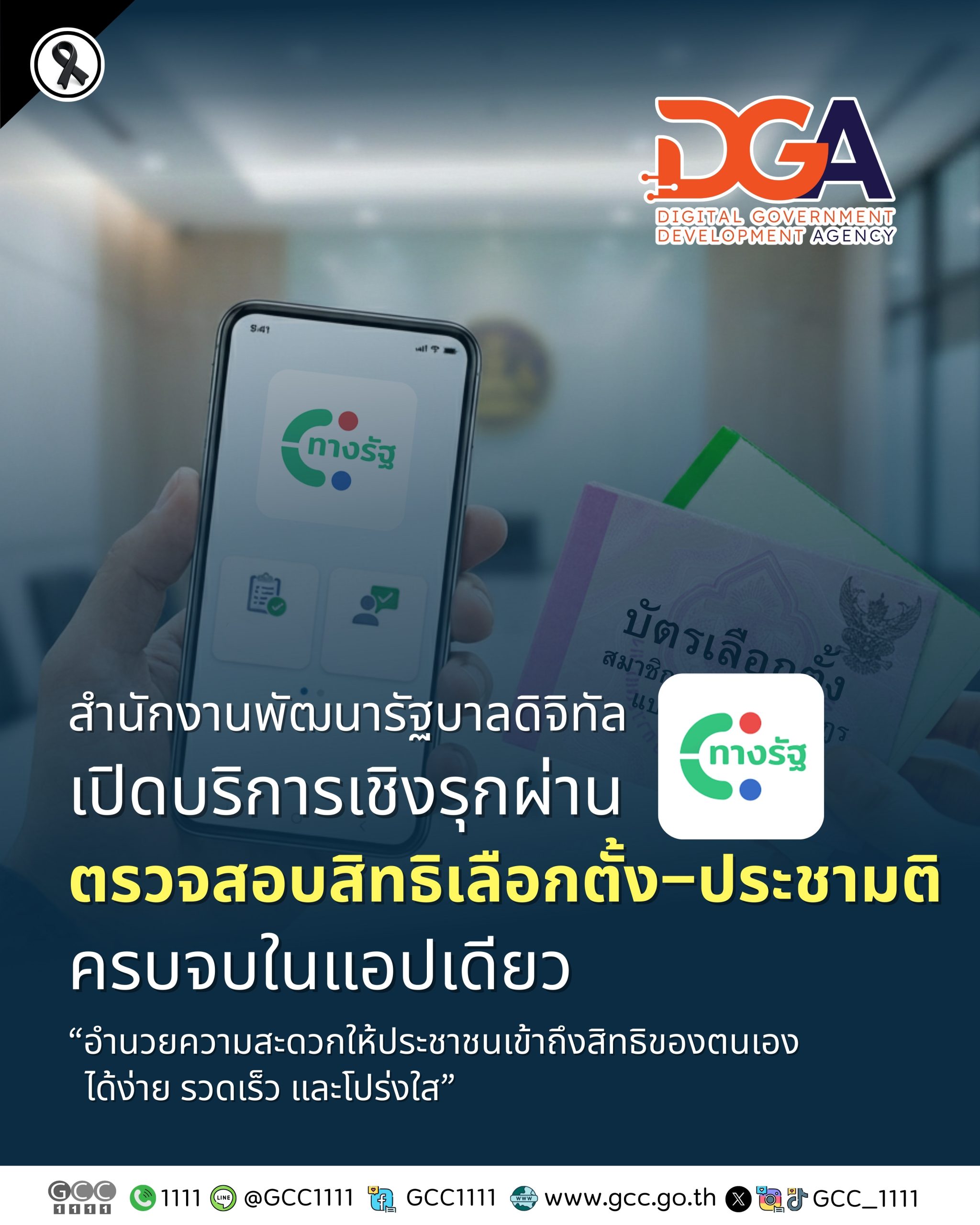 ในช่วงการเลือกตั้งสมาชิกสภาผู้แทนราษฎร ปี 2569 และการออกเสียงประชามติ ปี 2569 DGA ได้พัฒนาช่องทางบริการเชิงรุกผ่าน แอปพลิเคชัน “ทางรัฐ” เพื่อให้ประชาชนสามารถตรวจสอบข้อมูลสำคัญได้ด้วยตนเองทุกที่ทุกเวลา ลดภาระ ลดขั้นตอน และเพิ่มความมั่นใจในการใช้สิทธิ