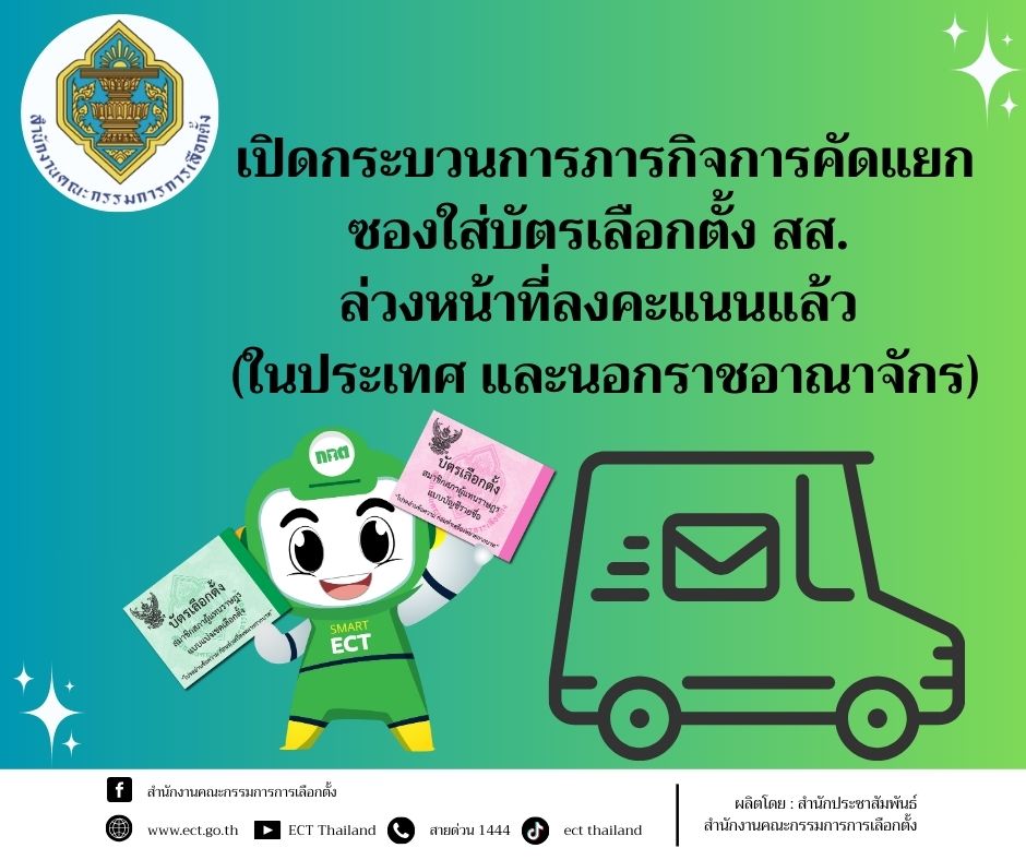 วันที่ 3 กุมภาพันธ์ 2569 เวลา 14.00 น. สำนักงานคณะกรรมการการเลือกตั้ง (กกต.) ร่วมกับ บริษัท ไปรษณีย์ไทย จำกัด กรมการกงสุล กระทรวงการต่างประเทศ และสำนักงานตำรวจแห่งชาติ เดินหน้าภารกิจเลือกตั้งสมาชิกสภาผู้แทนราษฎร พร้อมคัดแยกซองใส่บัตรเลือกตั้ง สส. (ล่วงหน้า) ที่ลงคะแนนแล้วจากในประเทศ และนอกราชอาณาจักร เพื่อส่งมอบไปยังเขตเลือกตั้ง 400 เขตทั่วประเทศ ภายใต้มาตรการรักษาความปลอดภัยและการตรวจสอบที่เข้มงวดทุกขั้นตอน เพื่อให้กระบวนการเลือกตั้ง สส. เป็นไปด้วยความเรียบร้อย โปร่งใส และตรงตามเจตนารมณ์ของผู้มีสิทธิเลือกตั้ง สส.