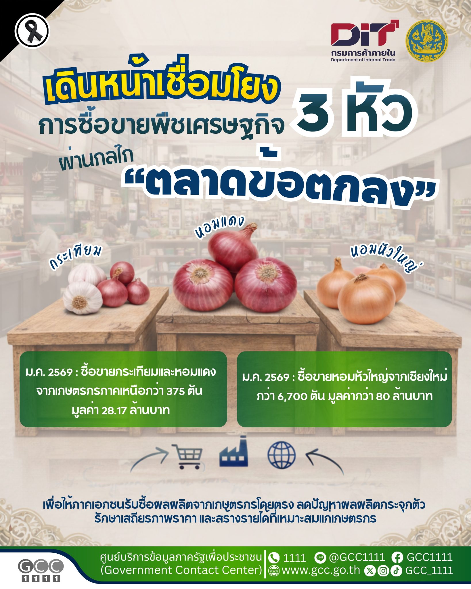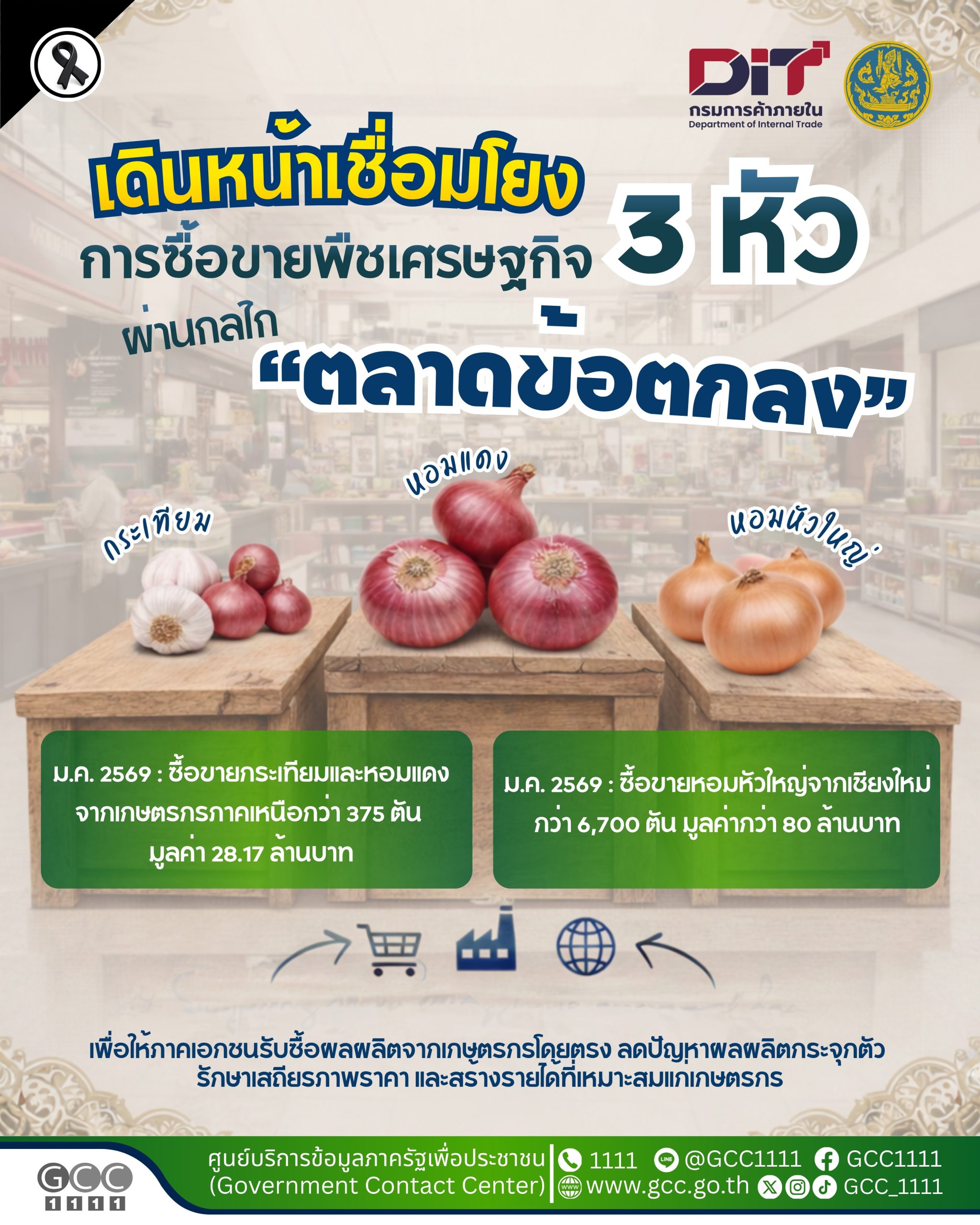 กรมการค้าภายใน เดินหน้าเชื่อมโยงการซื้อขายพืชเศรษฐกิจ 3 หัว ได้แก่ หอมแดง กระเทียม และหอมหัวใหญ่ ผ่านกลไก “ตลาดข้อตกลง” เพื่อให้ภาคเอกชนรับซื้อผลผลิตจากเกษตรกรโดยตรง ลดปัญหาผลผลิตกระจุกตัว รักษาเสถียรภาพราคา และสร้างรายได้ที่เหมาะสมแก่เกษตรกร