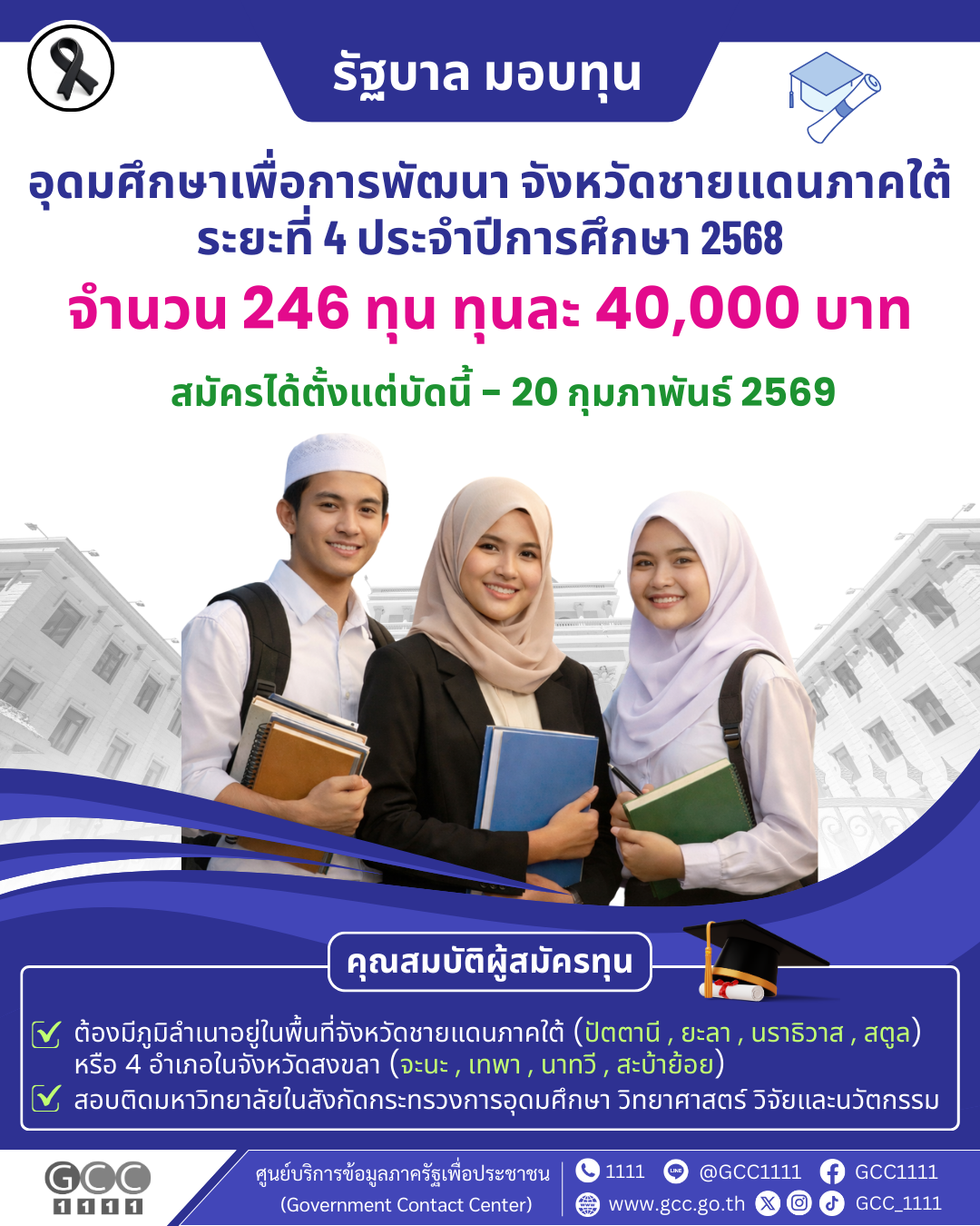 รัฐบาล มอบทุนอุดมศึกษาชายแดนใต้ หวังสร้างกำลังคนคืนถิ่น จำนวน 246 ทุน ทุนละ 4 หมื่นบาท เชิญชวนเยาวชนชายใต้แดนที่มีคุณสมบัติ สมัครได้ตั้งแต่บัดนี้ – 20 กุมภาพันธ์ 2569