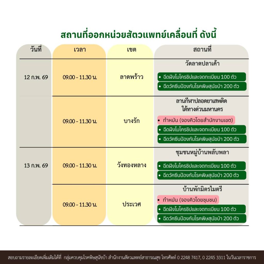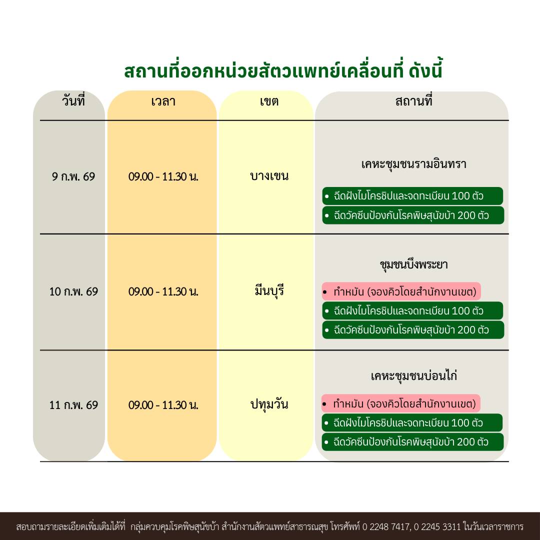 สำนักอนามัย กรุงเทพมหานคร ออกหน่วยสัตวแพทย์เคลื่อนที่ ข่าวสารกิจกรรม สำนักอนามัย กรุงเทพมหานคร ออกหน่วยสัตวแพทย์เคลื่อนที่ สำนักอนามัย กรุงเทพมหานคร ออกหน่วยสัตวแพทย์เคลื่อนที่ ฉีดวัคซีนป้องกันโรคพิษสุนัขบ้า ฉีดไมโครชิป และ ทำหมัน สำนักอนามัย กรุงเทพมหานคร ออกหน่วยสัตวแพทย์เคลื่อนที่ ฉีดวัคซีนป้องกันโรคพิษสุนัขบ้า ฉีดไมโครชิป และ ทำหมันสัตว์เลี้ยงที่นำมารับบริการทำหมัน1. ต้องมีสุขภาพดี แข็งแรง ไม่ป่วย2. ถ้าเป็นเพศเมียต้องไม่ท้อง3. มีอายุตั้งแต่ 6 เดือนขึ้นไป4. จับสัตว์ ขังกรง หรือตระกร้า งดน้ำงดอาหาร อย่างน้อย 8 – 10 ชั่วโมง ก่อนพามาทำหมันเพราะอาจทำให้เกิดการสำลักอาหารและอุดตันทางเดินหายใจระหว่างการผ่าตัดเป็นอันตรายถึงชีวิต5. อาบน้ำทำความสะอาดให้เรียบร้อย เนื่องจากหลังทำหมันไม่ควรอาบน้ำให้สัตว์เลี้ยง อย่างน้อย 7 วัน หรือจนกว่าแผลผ่าตัดจะหาย และเป็นการป้องกันแผลติดเชื้อ6. สำหรับแมวให้นำตระกร้า หรือ กรงขัง แมว ขนาดใหญ่มาด้วย เพื่อความสะดวกในการนำสัตว์กลับหลังจากการทำหมันเสร็จ7. สุนัขให้ผูกโซ่ หรือเชือก กับสายจูง ให้แน่นหนา ขณะที่นำมารับบริการ8. สุนัขหรือแมวพันธุ์เล็ก หรือพันธุ์ที่หน้าสั้น ไม่สามารถรับบริการทำหมันได้ ทั้งนี้อาจมีปัจจัยอื่นๆ เจ้าของควรปรึกษาสัตวแพทย์ก่อนทำหมันอีกครั้ง ที่มา : Facebook สำนักอนามัย กรุงเทพมหานคร Post Views: 6 FacebookFacebookXTwitterLINELine