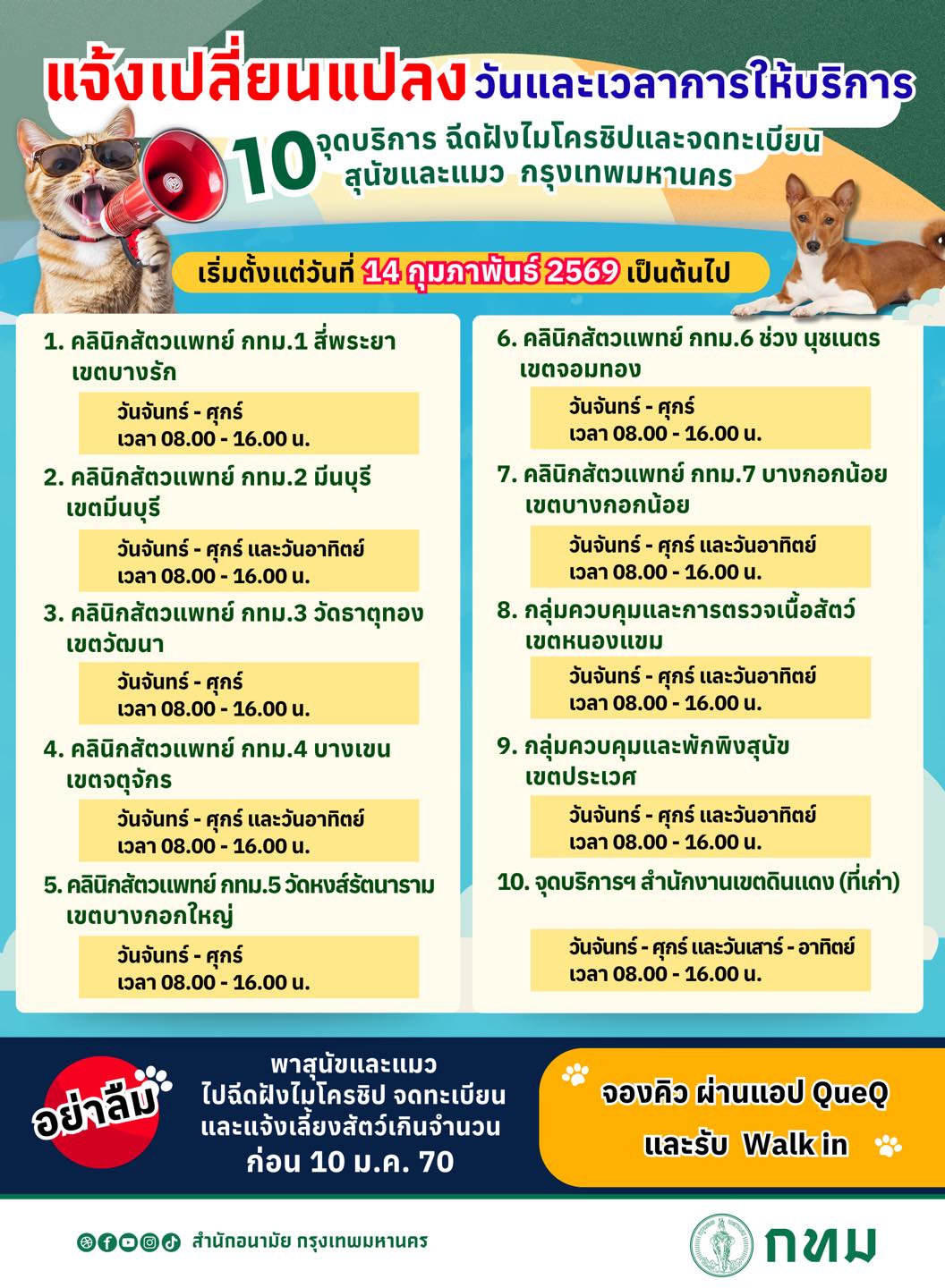 สำนักอนามัย กรุงเทพมหานคร แจ้งเปลี่ยนแปลงวันและเวลาการให้บริการ 10 จุดบริการฉีดฝังไมโครชิป และจดทะเบียนสุนัขแมว กรุงเทพมหานคร
