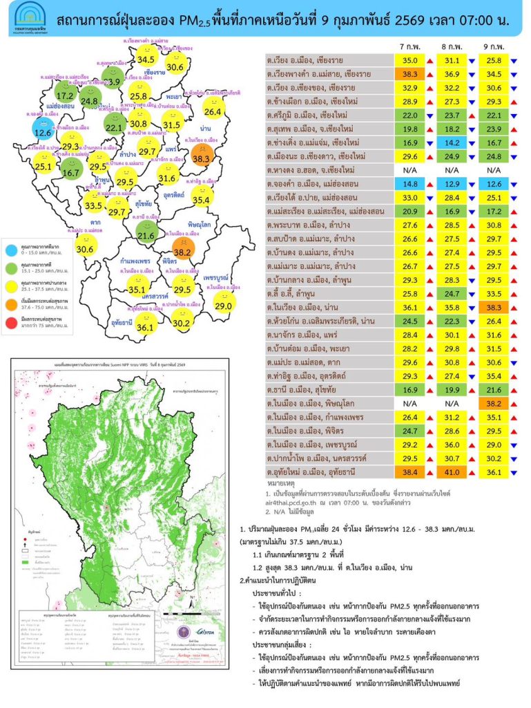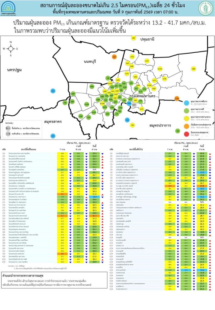 ศกพ. รายงานการติดตามตรวจสอบคุณภาพอากาศ ประจำวันที่ 9 กุมภาพันธ์ 2569 ข่าวสารกิจกรรม, สาธารณภัย ศูนย์สื่อสารการแก้ไขปัญหามลพิษทางอากาศ รายงานการติดตามตรวจสอบคุณภาพอากาศ ประจำวันที่ 9 กุมภาพันธ์ 2569 ศูนย์สื่อสารการแก้ไขปัญหามลพิษทางอากาศ รายงานการติดตามตรวจสอบคุณภาพอากาศ ประจำวันที่ 9 กุมภาพันธ์ 2569 ณ 07:00 น สรุปดังนี้ภาพรวมปริมาณ PM2.5 ในประเทศอยู่ในเกณฑ์มาตรฐานเป็นส่วนใหญ่พบเกินค่ามาตรฐานใน 7 จังหวัดจ.นนทบุรี กรุงเทพฯ จ.น่าน จ.พิษณุโลก จ.สระบุรี จ.ปราจีนบุรี และ จ.สระแก้วภาคเหนือ เกินค่ามาตรฐาน 2 พื้นที่ ตรวจวัดได้ 12.6 – 38.3 ไมโครกรัมต่อลูกบาศก์เมตรภาคตะวันออกเฉียงเหนือ ภาพรวมอยู่ในเกณฑ์ดี ตรวจวัดได้ 9.0 – 27.9 ไมโครกรัมต่อลูกบาศก์เมตรภาคกลางและตะวันตก เกินค่ามาตรฐาน 1 พื้นที่ ตรวจวัดได้ 10.4 – 45.5 ไมโครกรัมต่อลูกบาศก์เมตรภาคตะวันออก เกินค่ามาตรฐาน 2 พื้นที่ ตรวจวัดได้ 14.1 – 44.0 ไมโครกรัมต่อลูกบาศก์เมตรภาคใต้ ภาพรวมอยู่ในเกณฑ์ดีมาก ตรวจวัดได้ 11.8 – 15.6 ไมโครกรัมต่อลูกบาศก์เมตรกรุงเทพมหานครและปริมณฑล เกินค่ามาตรฐาน 2 พื้นที่ ตรวจวัดได้ 13.2 – 41.7 ไมโครกรัมต่อลูกบาศก์เมตรคำแนะนำทางสุขภาพประชาชนทั่วไป : ควรเฝ้าระวังสุขภาพ ลดเวลาการทำกิจกรรมกลางแจ้ง หรือใช้อุปกรณ์ป้องกันตนเองผู้ที่ต้องดูแลสุขภาพเป็นพิเศษ : ควรลดระยะเวลาการทำกิจกรรมกลางแจ้ง หรือใช้อุปกรณ์ป้องกันตนเอง ถ้ามีอาการทางสุขภาพ ควรปรึกษาแพทย์โดยท่านสามารถติดตามสถานการณ์ผ่านทางเว็บไซต์ Air4Thai.com และ airbkk.com แอปพลิเคชัน Air4Thai และ AirBKK ที่มา : Facebook ศูนย์สื่อสารการแก้ไขปัญหามลพิษทางอากาศ Post Views: 12 FacebookFacebookXTwitterLINELine