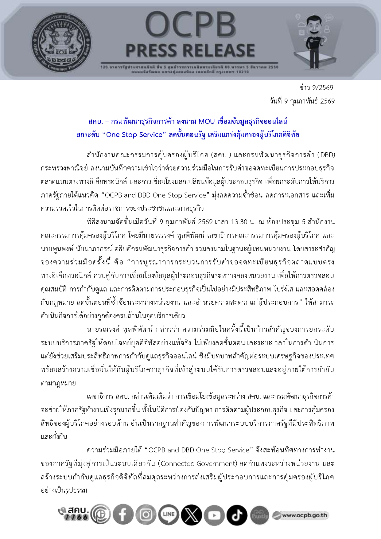 สำนักงานคณะกรรมการคุ้มครองผู้บริโภค (สคบ.) และกรมพัฒนาธุรกิจการค้า (DBD) กระทรวงพาณิชย์ ลงนามบันทึกความเข้าใจว่าด้วยความร่วมมือในการรับคำขอจดทะเบียนการประกอบธุรกิจ ตลาดแบบตรงทางอิเล็กทรอนิกส์ และการเชื่อมโยงแลกเปลี่ยนข้อมูลผู้ประกอบธุรกิจ เพื่อยกระดับการให้บริการ ภาครัฐภายใต้แนวคิด “OCPB and DBD One Stop Service” มุ่งลดความซ้ำซ้อน ลดภาระเอกสาร และเพิ่ม ความรวดเร็วในการติดต่อราชการของประชาชนและภาคธุรกิจ