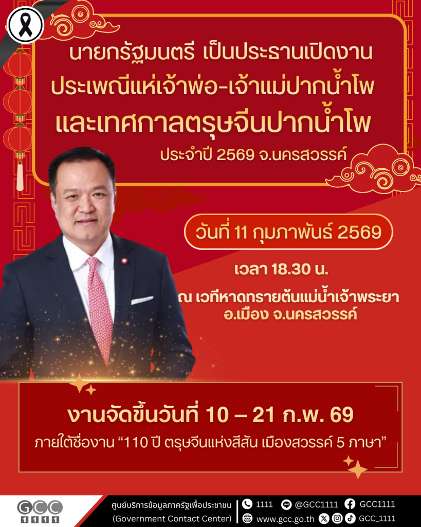 นายกรัฐมนตรี เป็นประธานเปิดงานประเพณีแห่เจ้าพ่อ–เจ้าแม่ปากน้ำโพ และเทศกาลตรุษจีนปากน้ำโพ จังหวัดนครสวรรค์ ประจำปี 2569 ในวันพุธที่ 11 กุมภาพันธ์ 2569 เวลา 18.30 น. ณ เวทีหาดทรายต้นแม่น้ำเจ้าพระยา อำเภอเมือง จังหวัดนครสวรรค์ ซึ่งงานจัดขึ้นระหว่างวันที่ 10 – 21 กุมภาพันธ์ 2569 ภายใต้ชื่องาน “110 ปี ตรุษจีนแห่งสีสัน เมืองสวรรค์ 5 ภาษา” เป็นประเพณีสำคัญที่สะท้อนอัตลักษณ์และความภาคภูมิใจของชาวนครสวรรค์ พร้อมส่งเสริมเศรษฐกิจและการท่องเที่ยวในพื้นที่