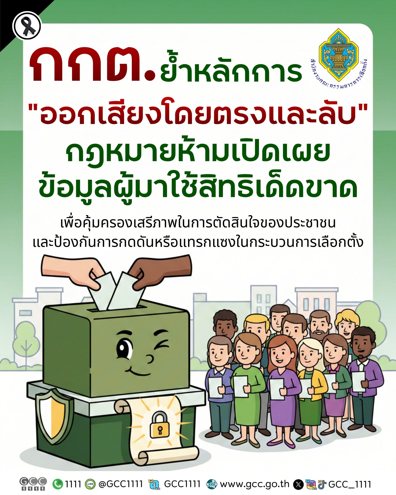 สำนักงานคณะกรรมการการเลือกตั้ง ขอยืนยันว่า การเลือกตั้งดำเนินไปภายใต้หลักการ “ออกเสียงโดยตรงและลับ” ทุกขั้นตอนมีมาตรการทางกฎหมายรองรับอย่างชัดเจน เพื่อให้ผู้มีสิทธิเลือกตั้งสามารถใช้สิทธิได้อย่างมั่นใจว่า ข้อมูลและการตัดสินใจของตนได้รับความคุ้มครองตามกฎหมาย