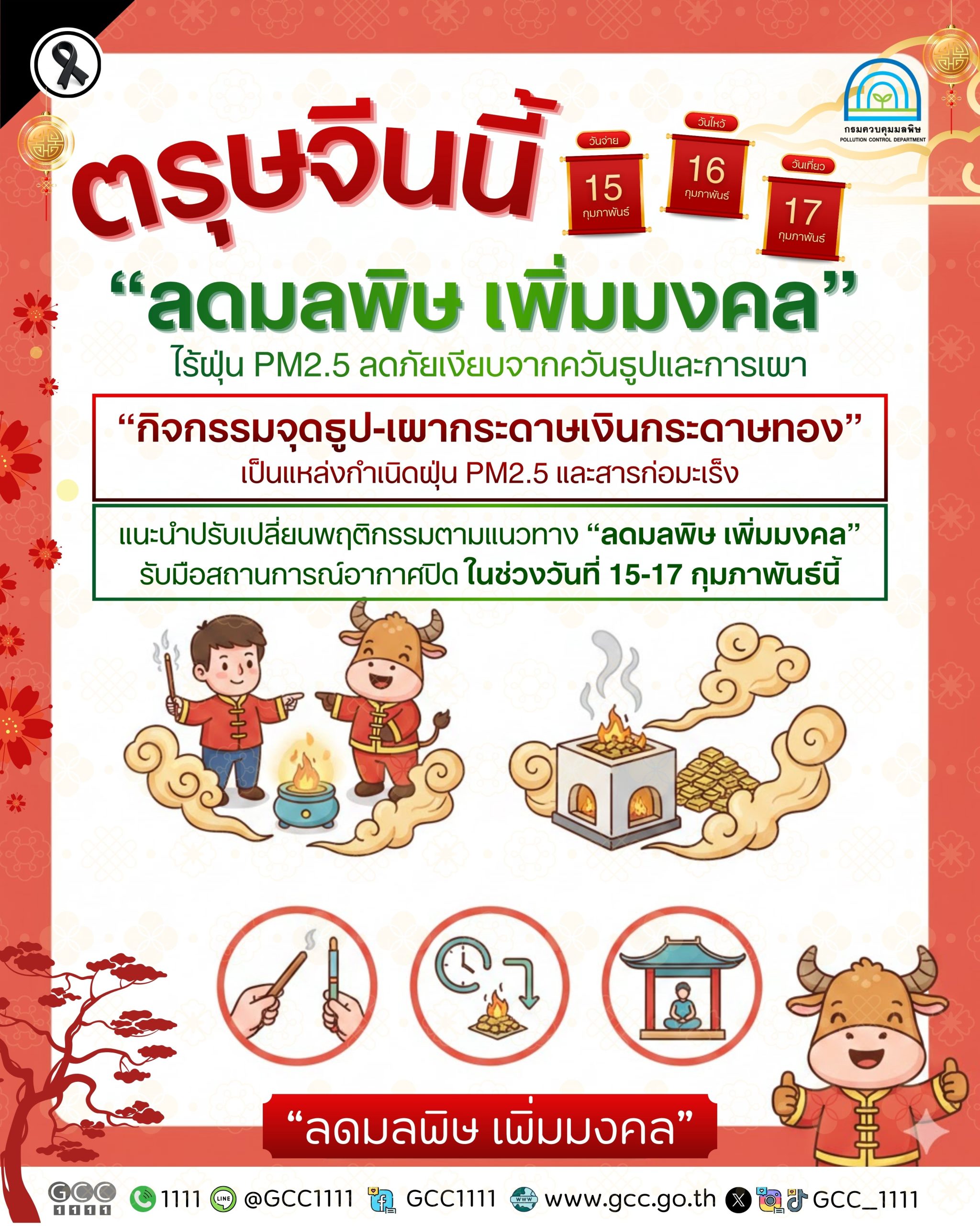 กรมควบคุมมลพิษ (คพ.) ห่วงใยสุขภาพอนามัยของประชาชนในช่วงเทศกาลตรุษจีน เผยกิจกรรมจุดธูป-เผากระดาษเงินกระดาษทอง เป็นแหล่งกำเนิดฝุ่น PM2.5 และสารก่อมะเร็ง แนะปรับเปลี่ยนพฤติกรรมตามแนวทาง “ลดมลพิษ เพิ่มมงคล” รับมือสถานการณ์อากาศปิดในช่วงวันที่ 15-17 กุมภาพันธ์นี้