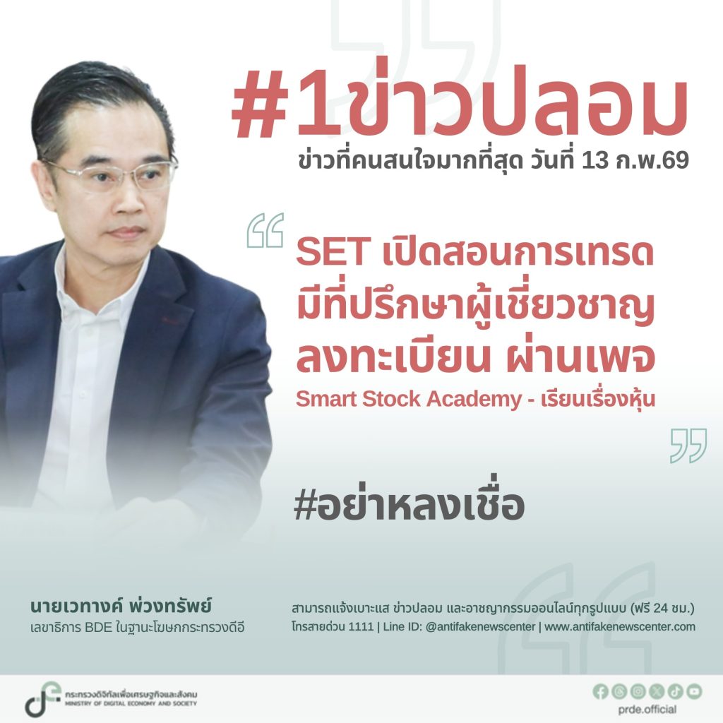 กระทรวงดิจิทัลเพื่อเศรษฐกิจและสังคม เตือนข่าวปลอม “SET เปิดสอนเทรดหุ้น ผ่านเพจ Smart Stock Academy” เสี่ยงสูญเงิน-ข้อมูลส่วนบุคคล