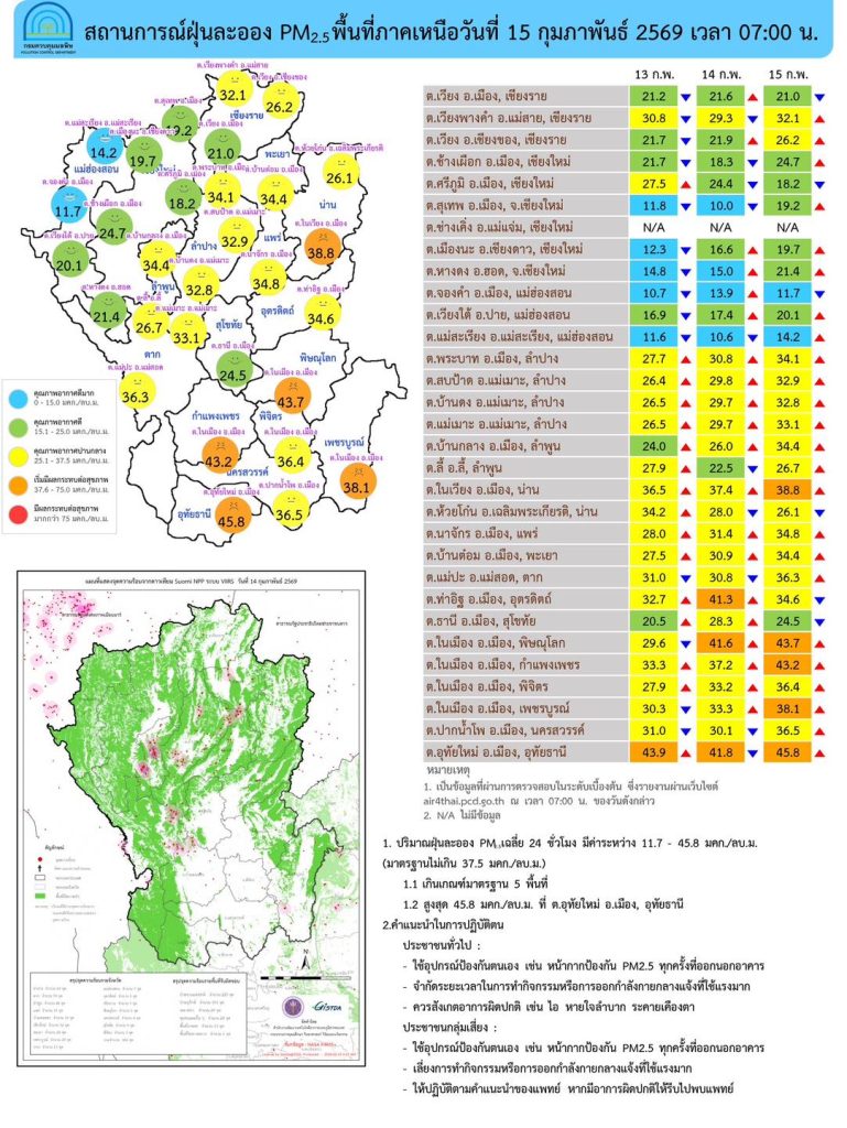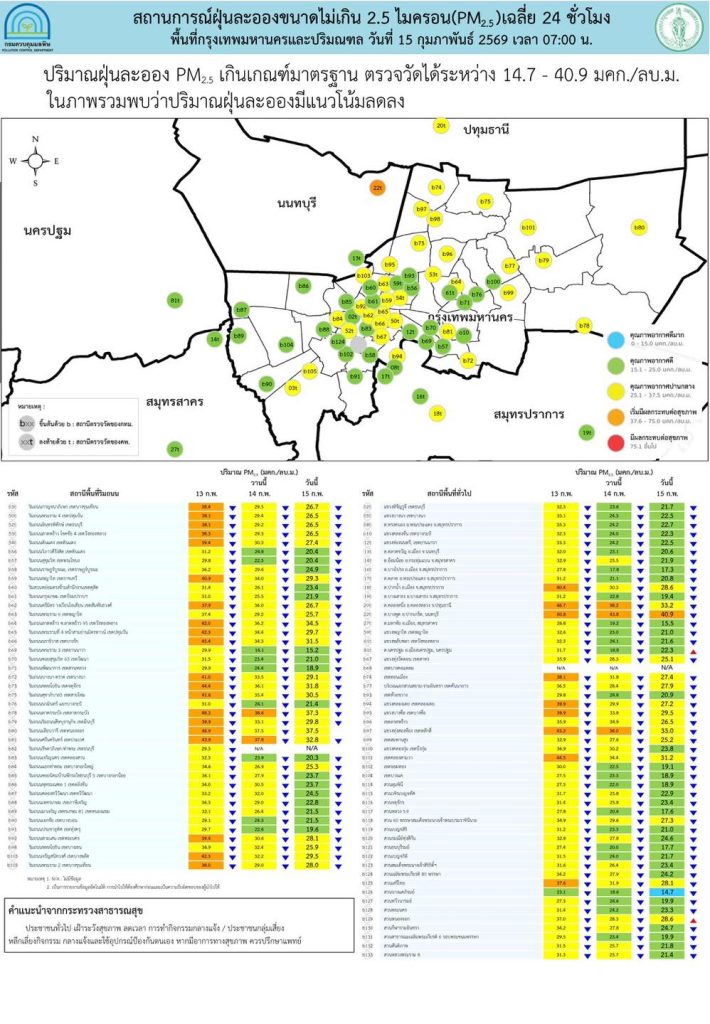 ศูนย์สื่อสารการแก้ไขปัญหามลพิษทางอากาศ รายงานการติดตามตรวจสอบคุณภาพอากาศ ประจำวันที่ 15 กุมภาพันธ์ 2569 เวลา 07.00 น. สรุปดังนี้