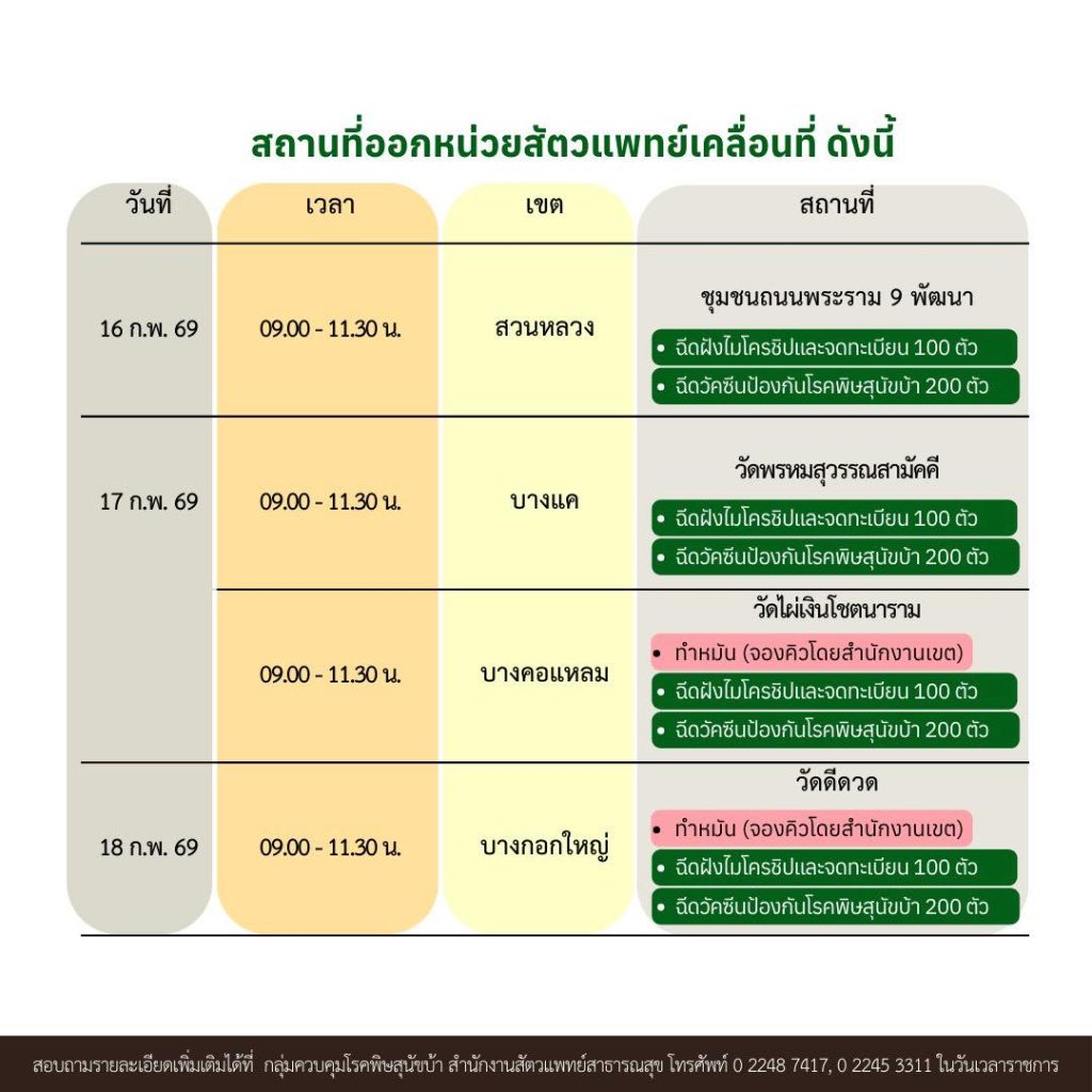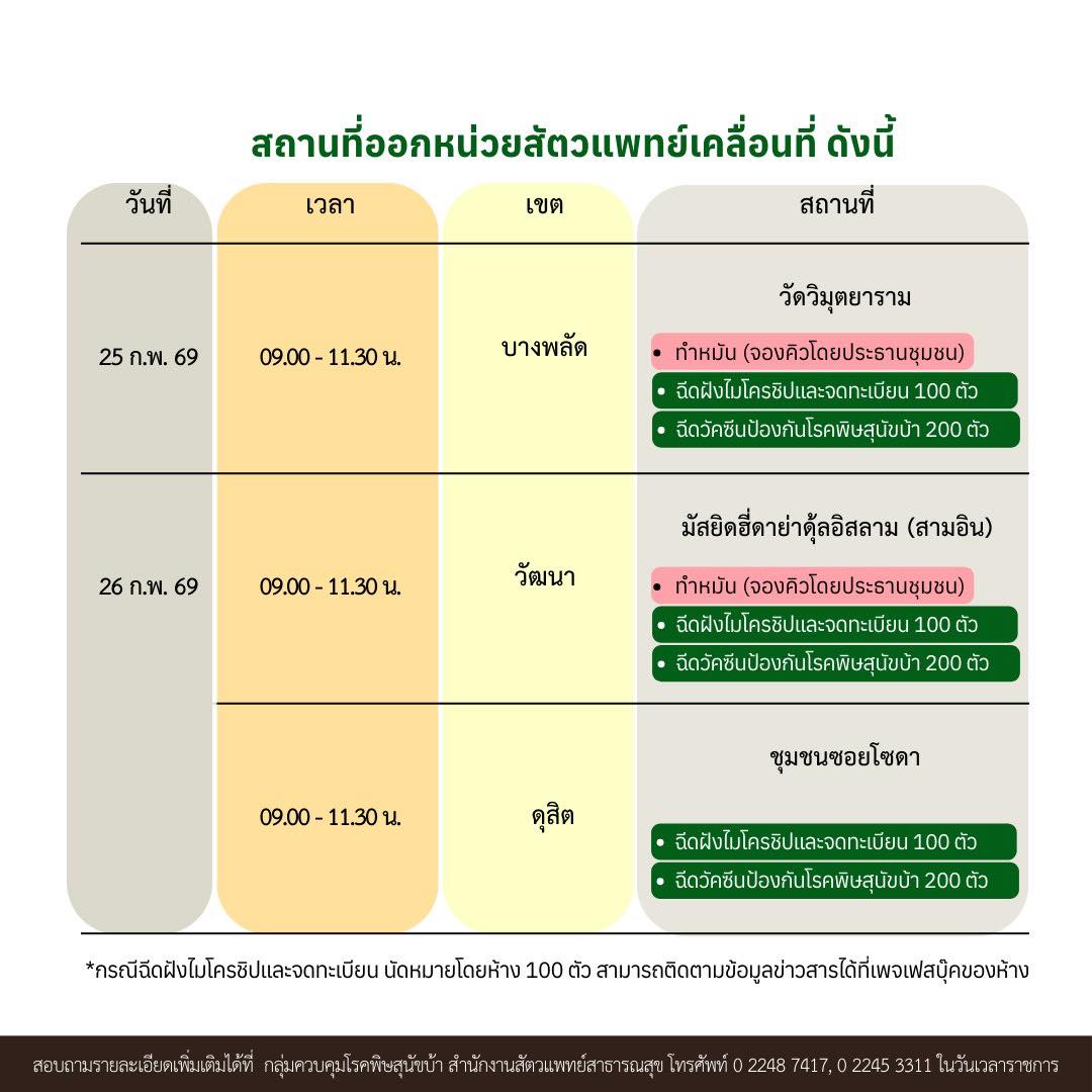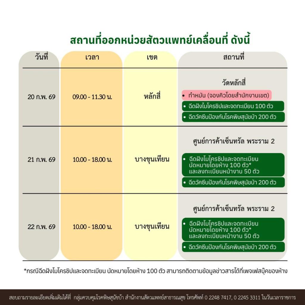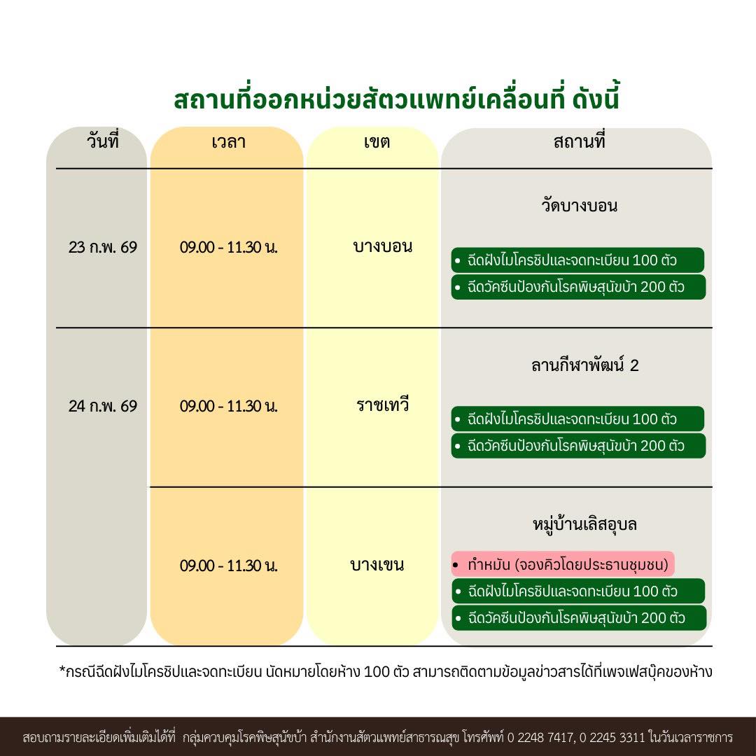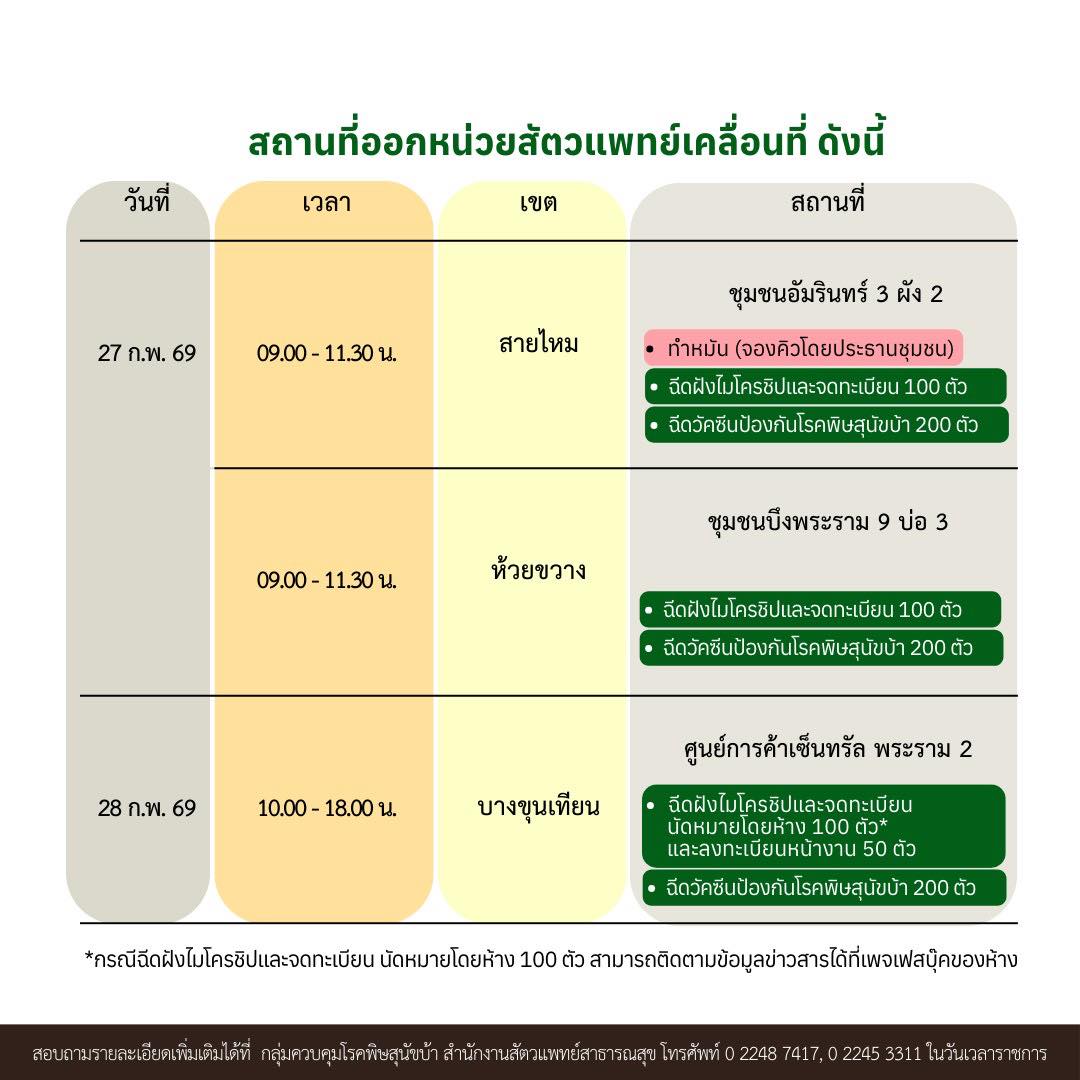 สำนักอนามัย กรุงเทพมหานคร ออกหน่วยสัตวแพทย์เคลื่อนที่ เดือนกุมภาพันธ์ ข่าวสารกิจกรรม สำนักอนามัย กรุงเทพมหานคร ออกหน่วยสัตวแพทย์เคลื่อนที่ เดือนกุมภาพันธ์ สำนักอนามัย ชวนพาน้อนๆมาฉีด วัคซีนป้องกันโรคพิษสุนัขบ้า ฉีดไมโครชิป และทำหมัน โดยหน่วยสัตวแพทย์เคลื่อนที่ สัตว์เลี้ยงที่นำมารับบริการทำหมัน1. ต้องมีสุขภาพดี แข็งแรง ไม่ป่วย2. ถ้าเป็นเพศเมียต้องไม่ท้อง3. มีอายุตั้งแต่ 6 เดือนขึ้นไป4. จับสัตว์ ขังกรง หรือตระกร้า งดน้ำงดอาหาร อย่างน้อย 8 – 10 ชั่วโมง ก่อนพามาทำหมันเพราะอาจทำให้เกิดการสำลักอาหารและอุดตันทางเดินหายใจระหว่างการผ่าตัดเป็นอันตรายถึงชีวิต5. อาบน้ำทำความสะอาดให้เรียบร้อย เนื่องจากหลังทำหมันไม่ควรอาบน้ำให้สัตว์เลี้ยง อย่างน้อย 7 วัน หรือจนกว่าแผลผ่าตัดจะหาย และเป็นการป้องกันแผลติดเชื้อ6. สำหรับแมวให้นำตระกร้า หรือ กรงขัง แมว ขนาดใหญ่มาด้วย เพื่อความสะดวกในการนำสัตว์กลับหลังจากการทำหมันเสร็จ7. สุนัขให้ผูกโซ่ หรือเชือก กับสายจูง ให้แน่นหนา ขณะที่นำมารับบริการ8. สุนัขหรือแมวพันธุ์เล็ก หรือพันธุ์ที่หน้าสั้น ไม่สามารถรับบริการทำหมันได้ ทั้งนี้อาจมีปัจจัยอื่นๆ เจ้าของควรปรึกษาสัตวแพทย์ก่อนทำหมันอีกครั้ง ที่มา Facebook สำนักอนามัย กรุงเทพมหานคร Post Views: 7 FacebookFacebookXTwitterLINELine