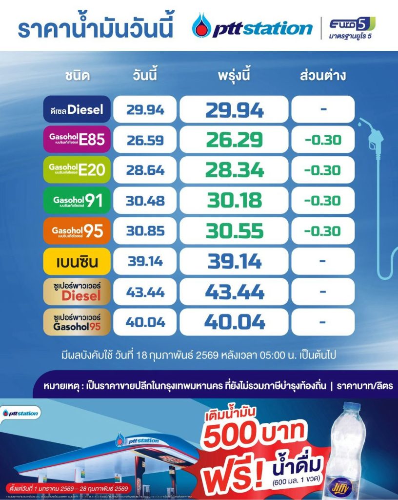 ปตท. ปรับลดราคาน้ำมัน กลุ่มแก๊สโซฮอล์ 30 สตางค์/ลิตร ยกเว้นน้ำมัน เบนซิน, ดีเซล, ซูเปอร์พาวเวอร์ดีเซล และ ซูเปอร์พาวเวอร์แก๊สโซฮอล์ 95 ราคาคงเดิม มีผลวันที่ 18 กุมภาพันธ์ 2569 ตั้งแต่เวลา 05.00 น. เป็นต้นไป ราคาที่ประกาศเป็นราคาขายปลีกในกรุงเทพมหานคร ที่ยังไม่รวมภาษีบำรุงท้องถิ่น