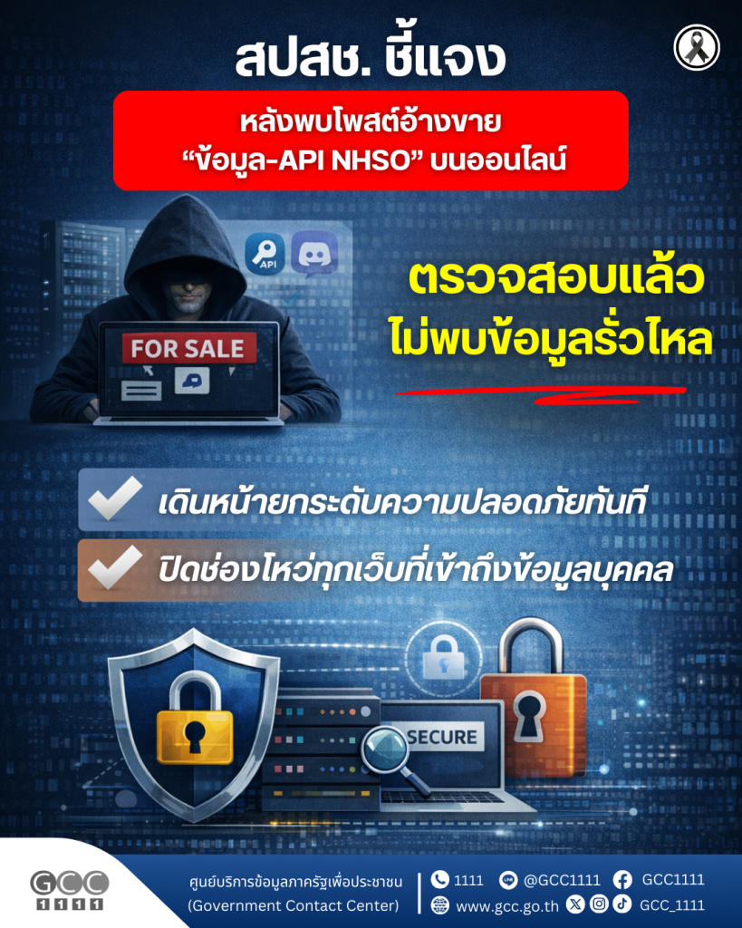 สำนักงานหลักประกันสุขภาพแห่งชาติ ชี้แจง หลังพบโพสต์อ้างขาย “ข้อมูล–API NHSO” บน Discord ตรวจสอบแล้ว ยืนยันไม่พบข้อมูลหลุดจากระบบ เดินหน้ายกระดับความปลอดภัยทันที ปิดช่องโหว่ทุกเว็บที่เข้าถึงข้อมูลส่วนบุคคล