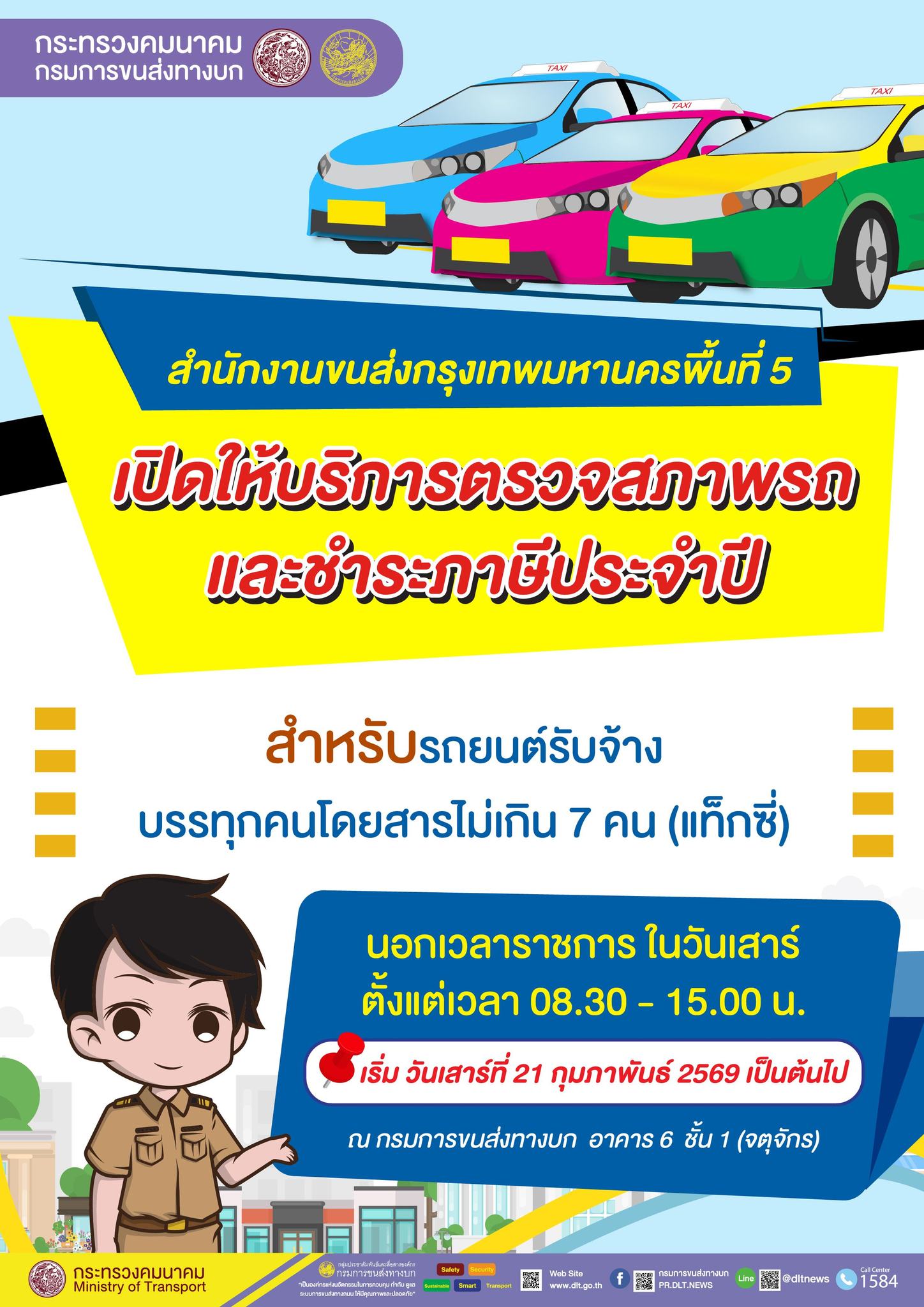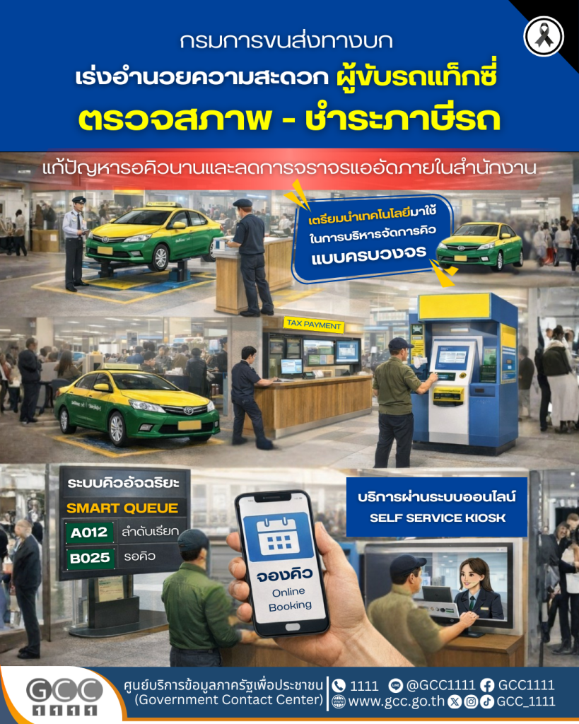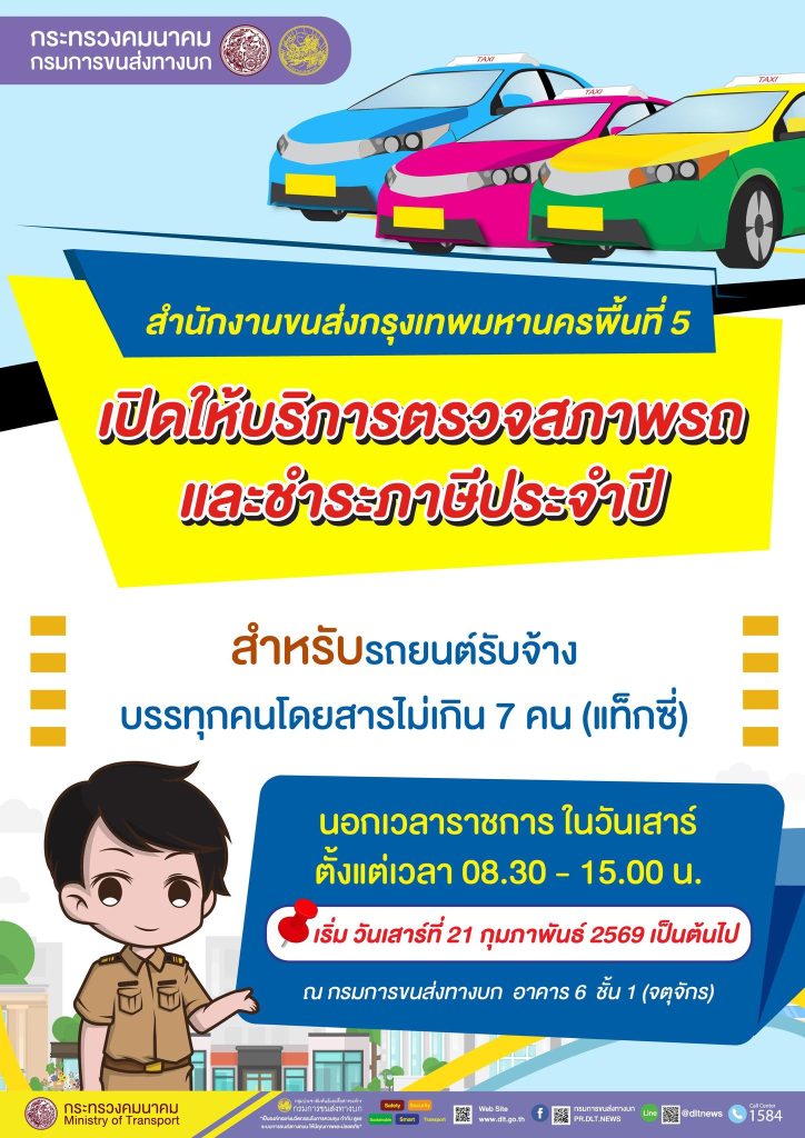 กรมการขนส่งทางบก เร่งอำนวยความสะดวกผู้ขับรถแท็กซี่ ตรวจสภาพ – ชำระภาษีรถ แก้ปัญหารอคิวนานและลดการจราจรแออัดภายในสำนักงาน เตรียมนำเทคโนโลยีมาใช้ในการบริหารจัดการคิวแบบครบวงจร เปิดให้บริการตรวจสภาพรถและชำระภาษีประจำปี สำหรับรถยนต์รับจ้างบรรทุกคนโดยสารไม่เกิน 7 คน (แท็กซี่) นอกเวลาราชการ ในวันเสาร์ ตั้งแต่เวลา 08.30 – 15.00 น. ณ กรมการขนส่งทางบก อาคาร 6 ชั้น 1 (จตุจักร) เริ่มวันเสาร์ที่ 21 กุมภาพัน 2569 เป็นต้นไป