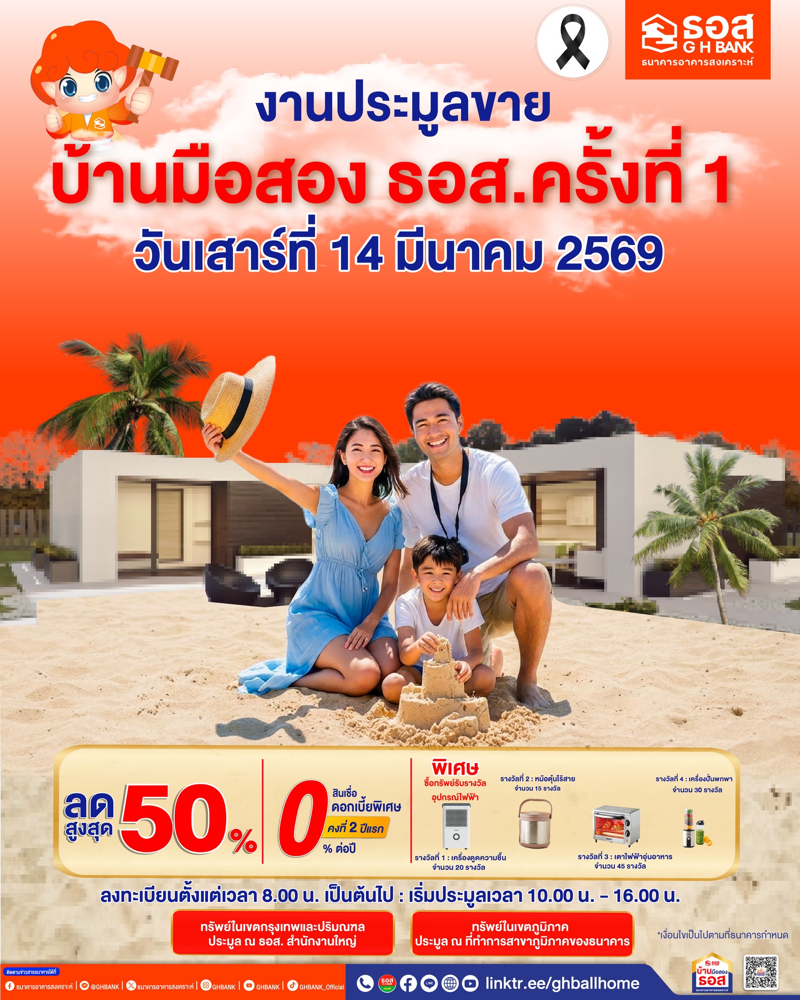งาน “ประมูลขายบ้านมือสอง ธอส. ประจำปี 2569 ครั้งที่ 1 ลดราคาสูงสุด 50% สินเชื่อดอกเบี้ยพิเศษ 0% ต่อปี คงที่ 2 ปีแรก (สำหรับลูกค้าที่จองซื้อทรัพย์ภายในระยะเวลาจัดงาน และยื่นขอสินเชื่อภายใน 45 วัน นับถัดจากวันที่ทำสัญญาจะซื้อจะขาย)