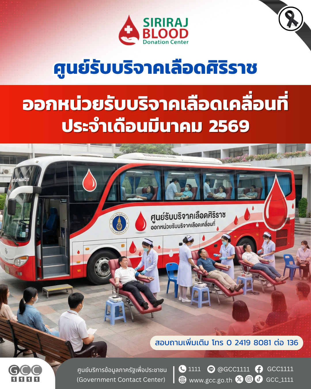 - ให้บริการในวันและเวลาราชการ ติดต่อทีมงานรับบริจาคเลือดเคลื่อนที่ ได้ที่ โทร: 0 2419 8081 ต่อ 110, 136